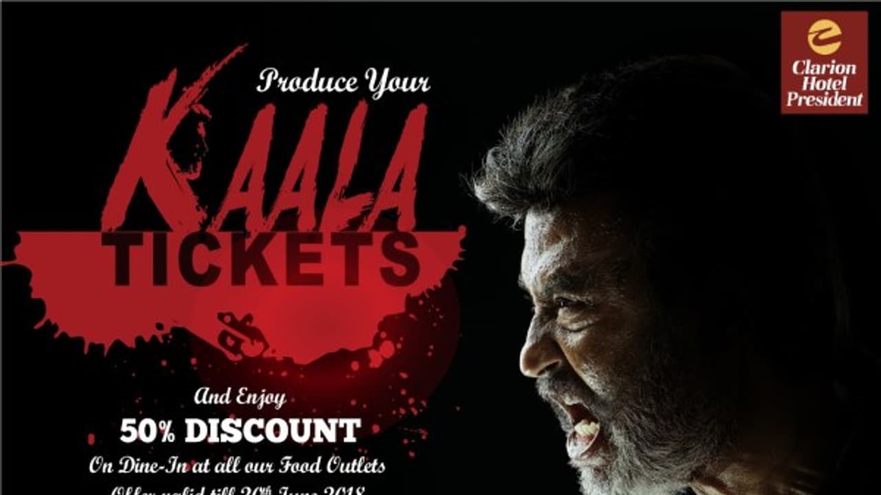 சென்னையில் உள்ள எந்த திரையரங்கிலும் காலா படம் பார்த்து விட்டு அந்த டிக்கெட்டோடு ராதாகிருஷ்ணன் சாலை சிட்டி சென்டர் அருகில் உள்ள கிளாரியன் ஹோட்டலுக்கு வாருங்கள். 5 நட்சத்திர ஹோட்டலில் குடும்பத்தோடு உயர்தரமான உணவருந்தலாம்.டிக்கெட்டை காட்டினால் உணவின் விலையில் 50 சதவீதம் தள்ளுபடி செய்யப்படும் என ஹோட்டல் நிர்வாகம் அறிவித்துள்ளது.