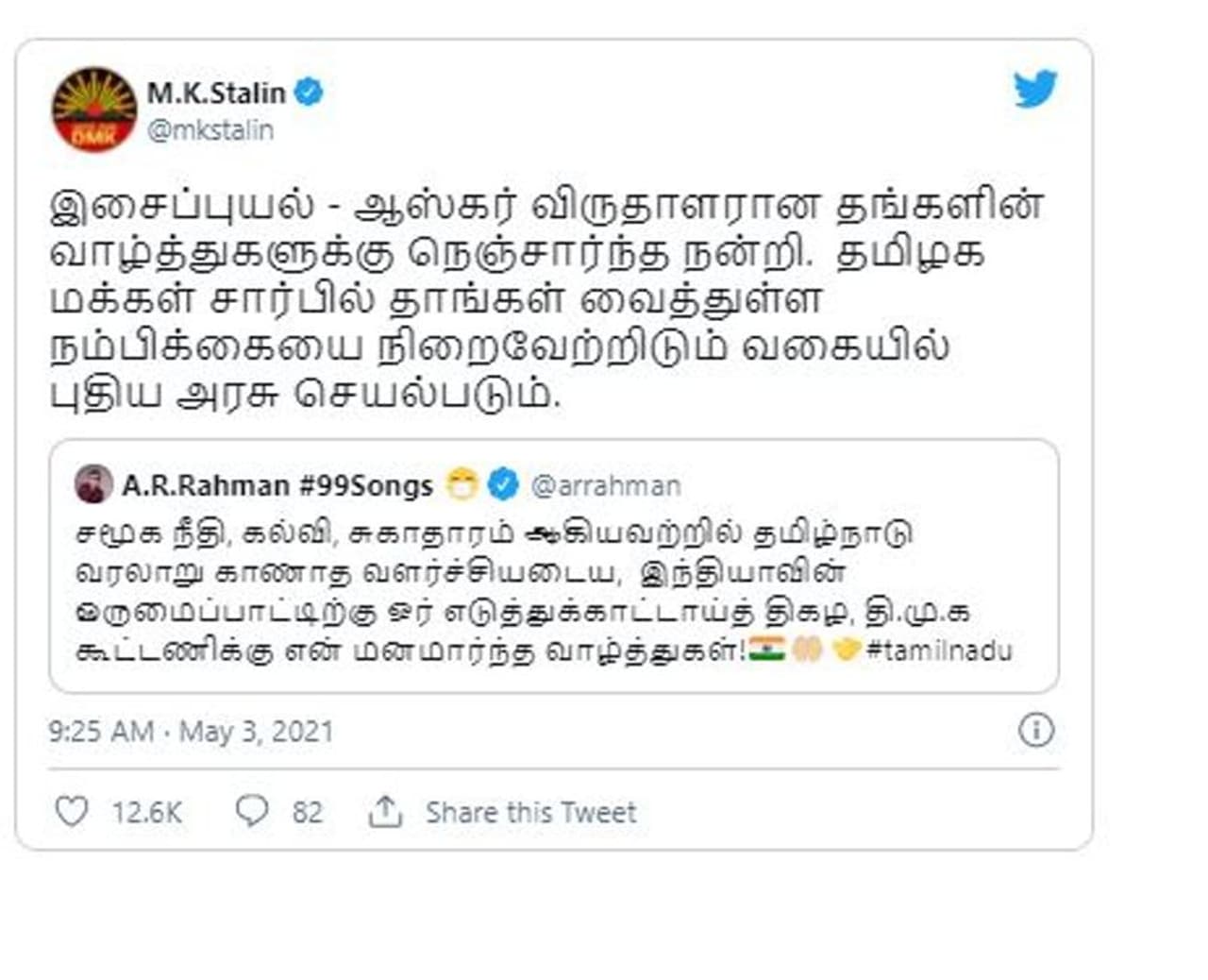 ஏ.ஆர்.ரகுமானின் இந்த பதிவிற்கு, திமுக தலைவர் ஸ்டாலின், இசைப்புயல் ஆஸ்கார் விருது அழகான தங்களின் வாழ்த்துக்களுக்கு நெஞ்சார்ந்த நன்றி. தமிழக மக்கள் சார்பில் தாங்கள் வைத்துள்ள நம்பிக்கையை நிறைவேற்றும் வகையில் புதிய அரசு செயல்படும்’ என்று வேறு லெவல் பதிலளித்துள்ளார். இதற்க்கு பலரும் தங்களுடைய வாழ்த்துக்களை தெரிவித்து வருகிறார்கள்.