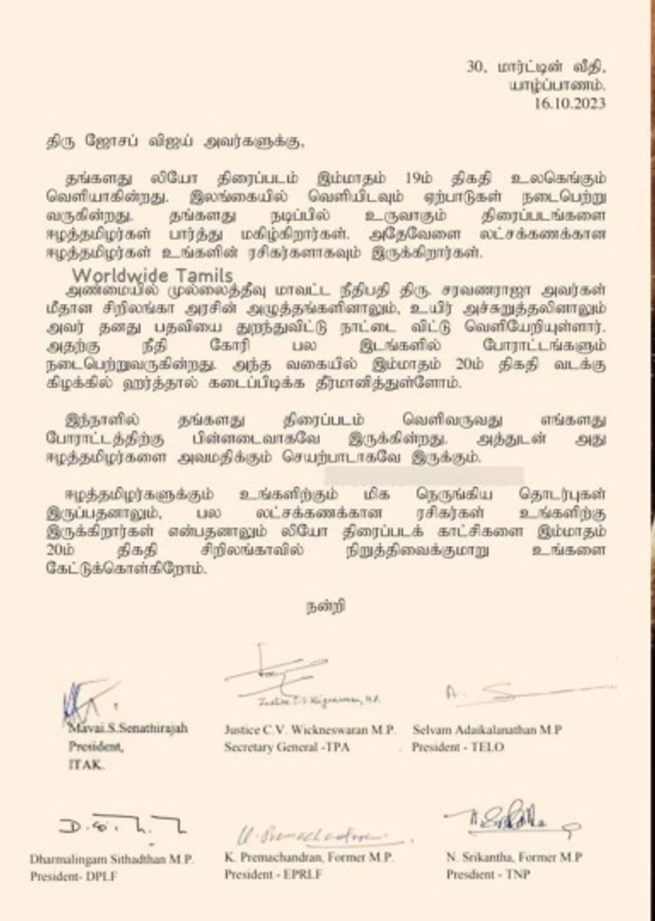 இதுகுறித்து வெளியாகியுள்ள கடிதத்தில் கூறியுள்ளதாவது, "ஜோசப் விஜய் அவர்களுக்கு தங்களது 'லியோ' திரைப்படம் இம்மாதம் 19 ஆம் தேதி உலகெங்கும் வெளியாகின்றது. இலங்கையில் வெளியிடவும் ஏற்பாடுகள் நடைபெற்று வருகிறது. தங்களது நடிப்பில் உருவாகும் திரைப்படங்களை ஈழத் தமிழர்கள் பார்த்து மகிழ்கிறார்கள். அதேவேளை இலட்சக்கணக்கான ஈழ தமிழர்கள் உங்களின் ரசிகர்களாகவும் இருக்கிறார்கள்.