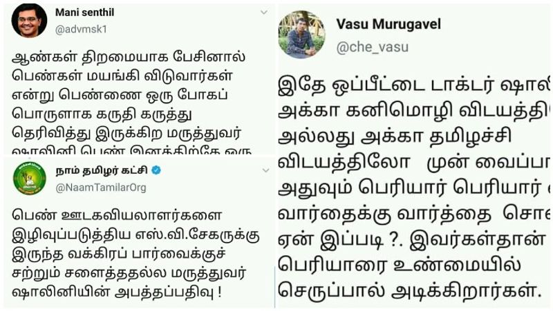பெண் ஊடகவியலாளர்களைக் கொச்சைப்படுத்திப் பதிவிட்ட எஸ்.சேகருக்கும், எங்களது உடன்பிறந்தார்களை இழிவாகப் பதிவிட்ட மருத்துவர் ஷாலினிக்கும் பெரிதாக எந்த வேறுபாடும் இல்லை. எஸ்.வி.சேகரைக் கண்டித்துப் போராடிய பெண்ணிய அமைப்புகள், மருத்துவர் ஷாலினியின் இந்த அபத்தமானப் பார்வைக்கு வாய்மூடி மௌனமாக நிற்பீர்களென்றால் பெண்ணியம் என்று பேச உங்கள் எவருக்கும் அருகதை இல்லை’ என்று கடுமையாக விமர்சித்திருந்தனர்.