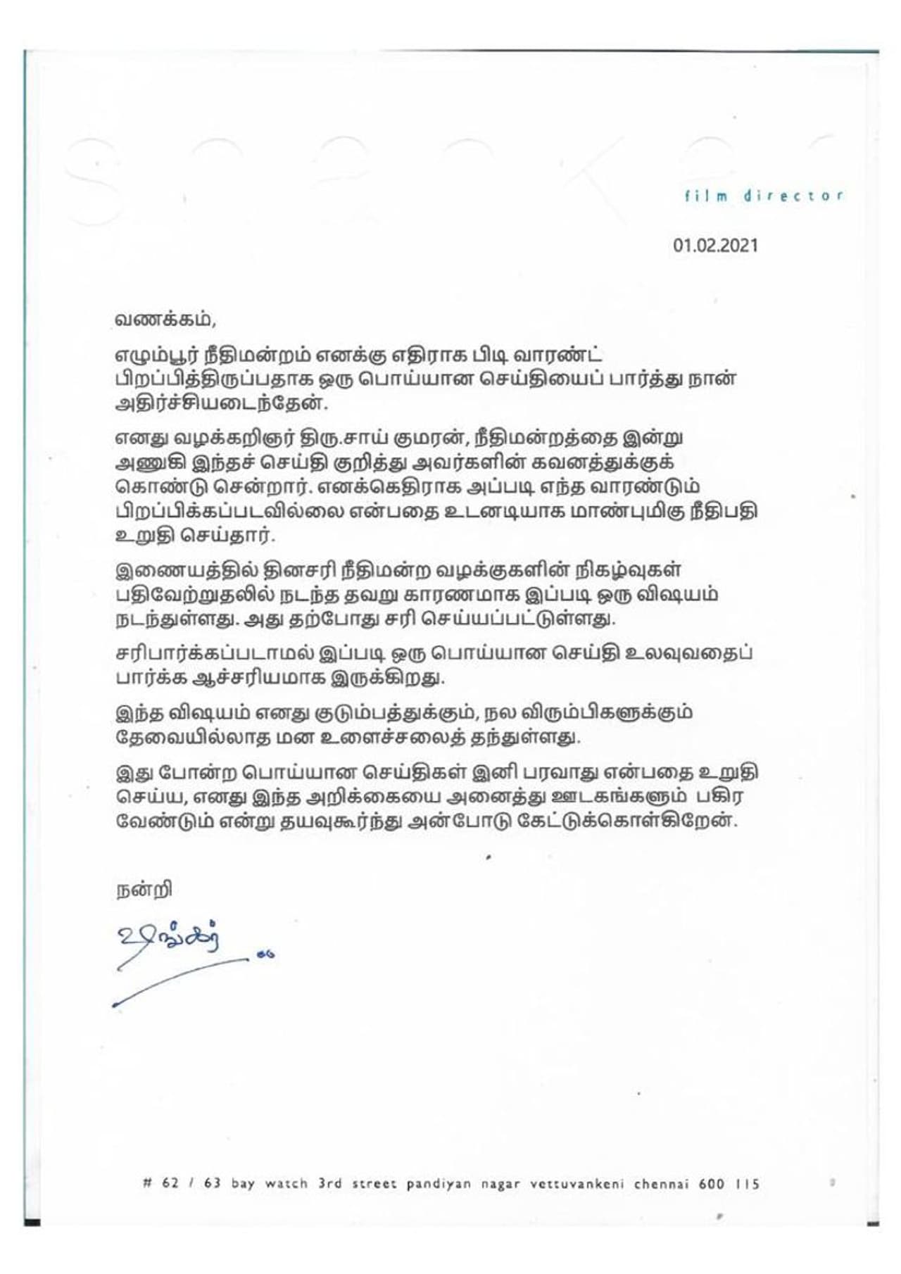 இதுகுறித்து அவர் வெளியிட்டுள்ள அறிக்கையில், எழும்பூர் நீதிமன்றம் எனக்கு எதிராக பிடி வாரண்ட் பிறப்பித்திருப்பதாக ஒரு பொய்யான செய்தியைப் பார்த்து நான் அதிர்ச்சியடைந்தேன்.எனது வழக்கறிஞர் திரு.சாய் குமரன், நீதிமன்றத்தை இன்றுஅணுகி இந்தச் செய்தி குறித்து அவர்களின் கவனத்துக்குக் கொண்டு சென்றார். எனக்கெதிராக அப்படி எந்த வாரண்டும் பிறப்பிக்கப்படவில்லை என்பதை உடனடியாக மாண்புமிகு நீதிபதி உறுதி செய்தார். இணையத்தில் தினசரி நீதிமன்ற வழக்குகளின் நிகழ்வுகள் பதிவேற்றுதலில் நடந்த தவறு காரணமாக இப்படி ஒரு விஷயம் நடந்துள்ளது, அது தற்போது சரி செய்யப்பட்டுள்ளது.