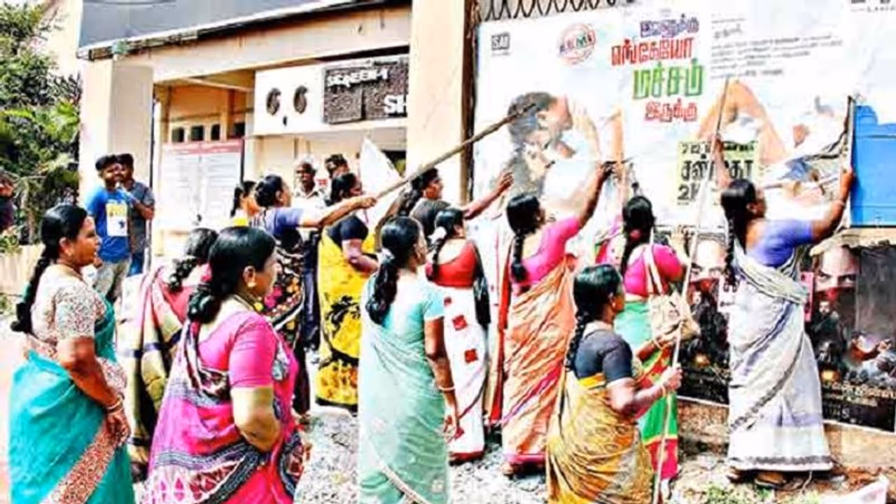 இந்தத் திரைப்படம் மதுரையில்காளவாசல் பகுதியில் உள்ளசண்முகாசினிகாம்ப்ளக்சில்வெளியாகிஓடிக்கொண்டிருக்கிறது. நேற்று காலைஅனைத்திந்தியஜனநாயகமாதர்சங்கம்சார்பில் 20-க்கும்மேற்பட்டபெண்கள்அங்கு திரண்டனர். அவர்கள்தியேட்டருக்குள்சென்றுஅங்கிருந்தபோஸ்டர்களைகிழித்தனர்.