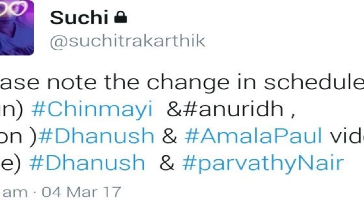 பிரபல பாடகியும், ஆர்.ஜேவும் ஆனா சுசித்ராவின் ட்விட்டர் பக்கத்தில் இருந்து பல நடிகைகளின் சர்ச்சைக்குரிய அந்தரங்க புகைப்படங்கள் தொடர்ந்து வெளியிடப்பட்டு வருகிறது...