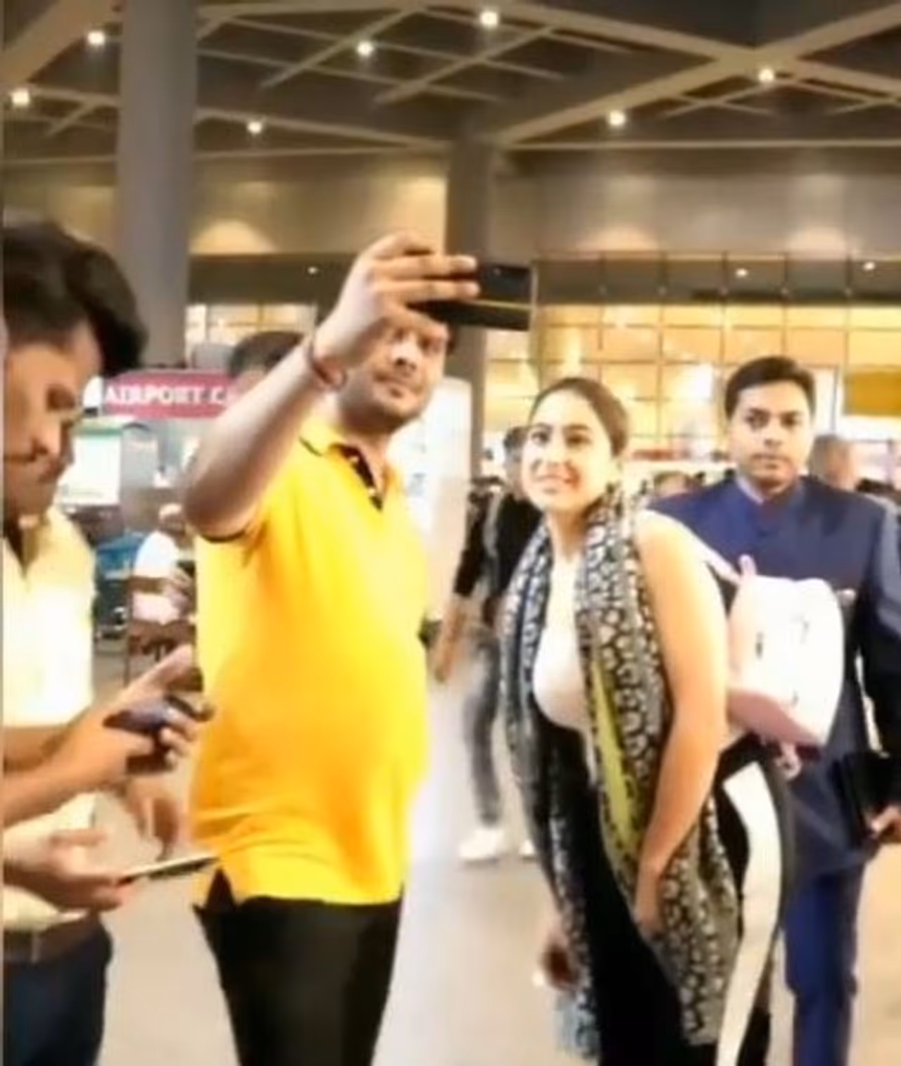 இந்நிலையில் பிரபல பாலிவுட் நடிகை சாரா அலிகான், நியூயார்க் நாட்டிற்கு சென்று விட்டு, மும்பை திரும்பியுள்ளார். விமான நிலையத்தில் அவரை கண்ட ரசிகர்கள், அடுக்கடுக்காக ஒருவர் பின் ஒருவர் வந்து அவருடன் போட்டோ எடுத்து கொள்ள அனுமதி கேட்டு புகைப்படம் எடுத்து கொண்டனர்.