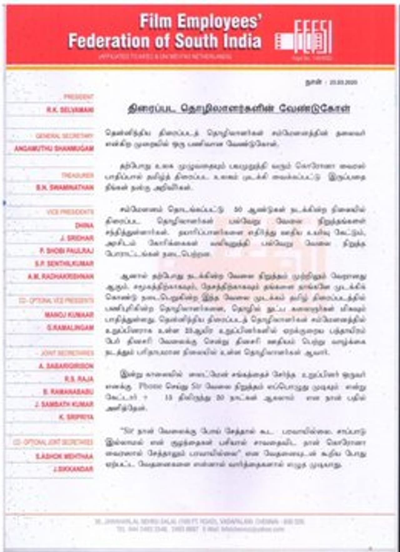 “தென்னிந்தியத் திரைப்படத் தொழிலாளர்கள் சம்மேளனத்தின் தலைவர் என்கிற முறையில் ஒரு பணிவான வேண்டுகோள். தற்போது உலக முழுவதையும் பயமுறுத்தி வரும் கரோனா வைரஸ் பாதிப்பால் தமிழ்த் திரைப்பட உலகம் முடக்கி வைக்கப்பட்டு இருப்பதை நீங்கள் நன்கு அறிவீர்கள்.