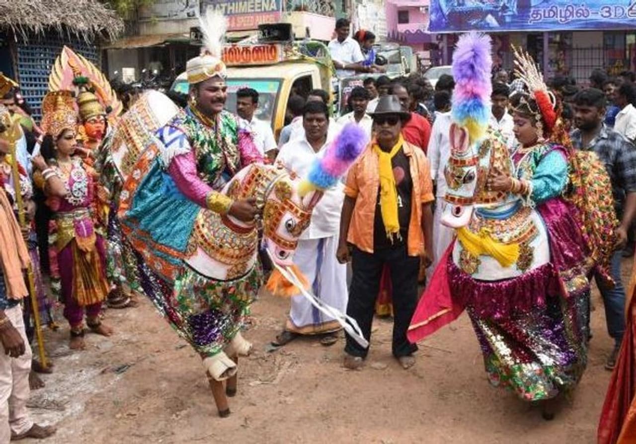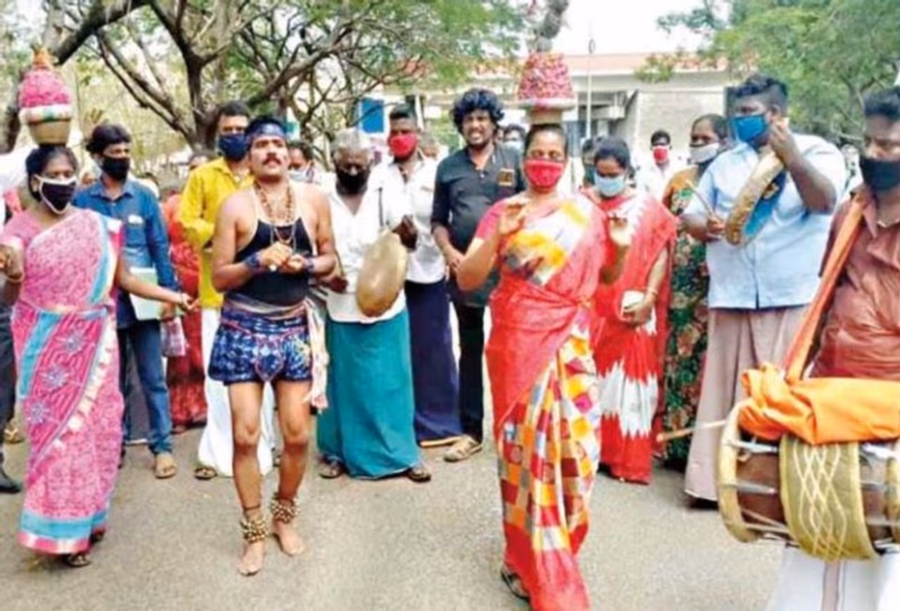 இதை தொடர்ந்து, மீண்டும் திருவிழாக்காலங்களில் போட்டப்பட்டுள்ள இந்த கட்டுப்பாடுகளால், தாங்கள் வாழ்வாதாரத்தை இழந்து உள்ளதாக, நாடக மற்றும் நாட்டுப்புற கலைஞர்கள் ஒன்று கூடி தமிழகம் முழுவதும் போராட்டத்தில் ஈடுபட்டு வருகிறார்கள். இந்த போராட்டத்தில், தப்பாட்டம், ஒயிலாட்டம் , மயிலாட்டம், கரகாட்டம், கூத்து பட்டறை கலைஞர்கள், நாடக கலைஞர்கள், கிராமிய இசை கலைஞர்கள் உள்ளிட்ட பலர் கலந்து கொண்டுள்ளனர்.