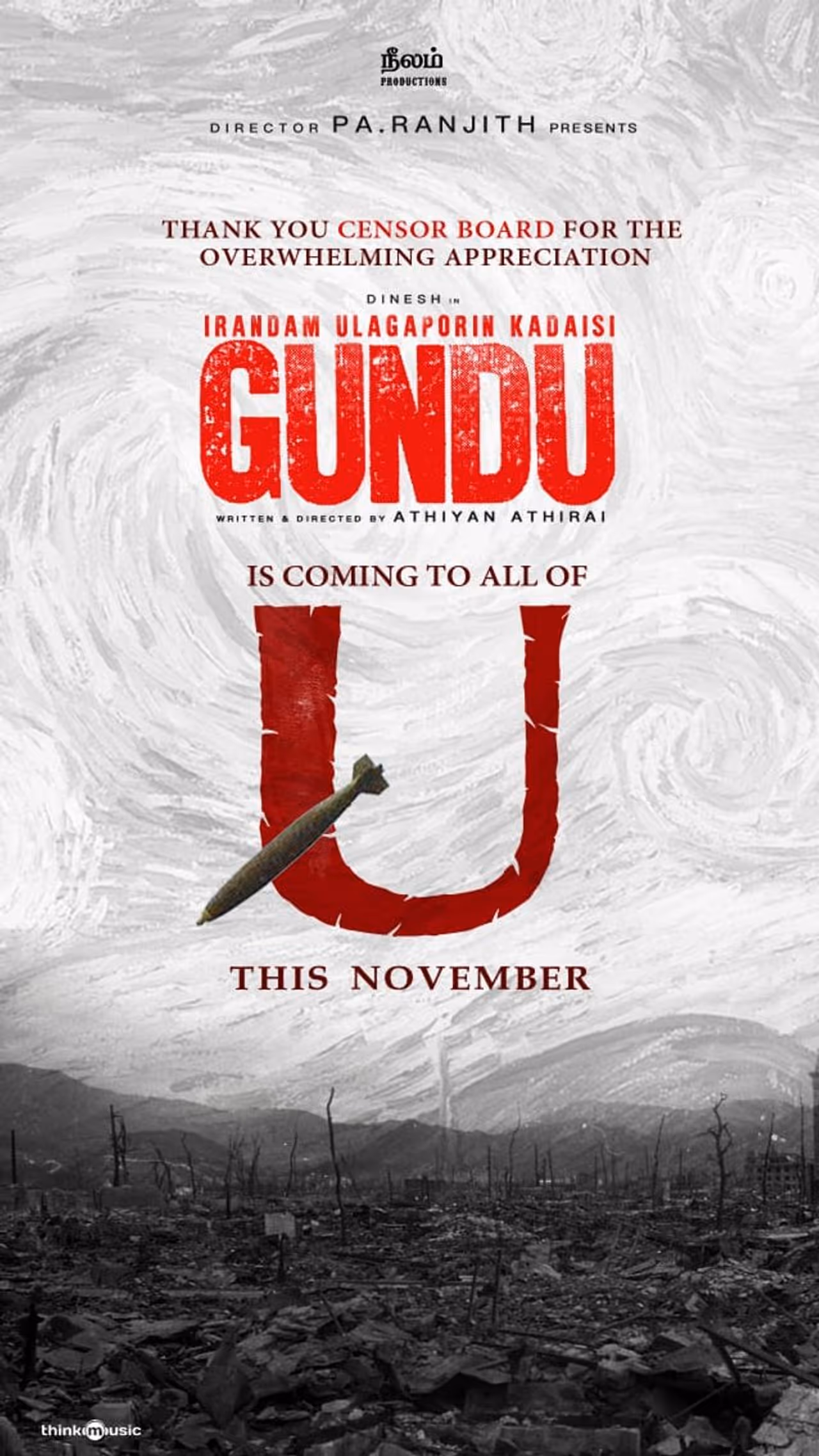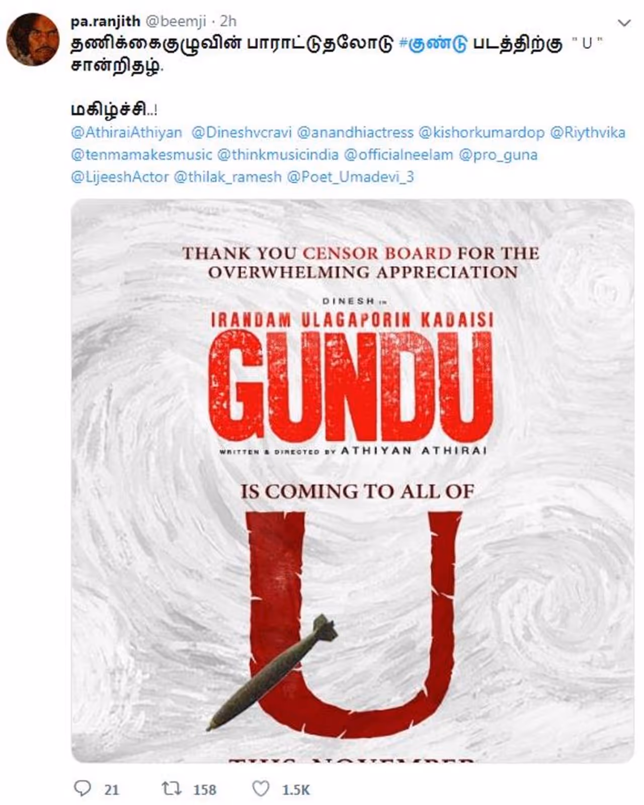 அத்துடன், குண்டு படத்திற்கு " U " சான்றிதழ் கொடுத்து படக்குழுவை மகிழ்ச்சியில் ஆழ்த்தியுள்ளனர். இந்த மகிழ்ச்சிகரமான செய்தியை, இயக்குநரும், தயாரிப்பாளருமான பா.ரஞ்சித், தனது டுவிட்டர் பக்கத்தில் தெரிவித்துள்ளார்.