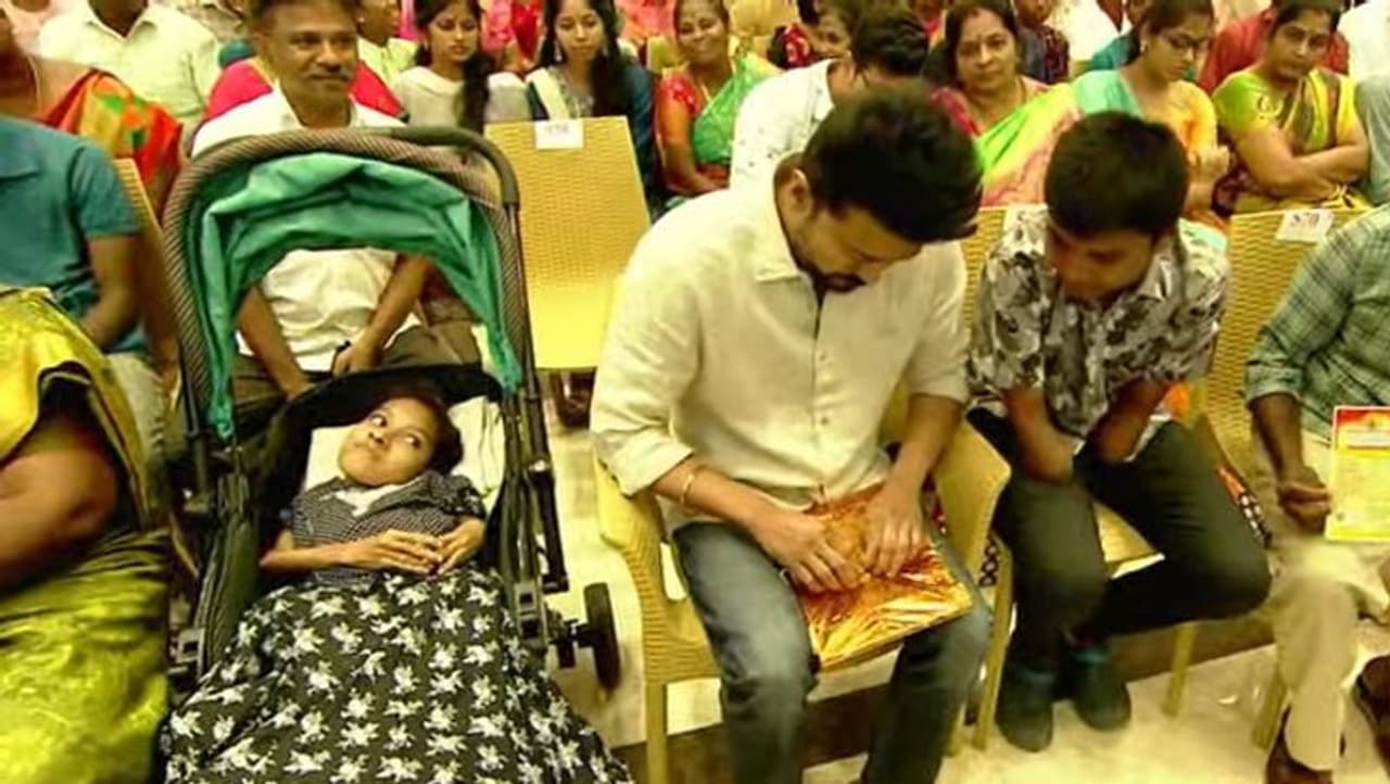 இந்த விழாவில் பங்கேற்பதற்காக நடிகர் விஜய் மேடைக்கு வந்து மாணவ, மாணவிகளை பார்த்து கையசைத்தார். இதன்பின் மேடையில் இருந்து கீழே இறங்கி வந்த விஜய், மாற்றுத்திறனாளி மாணவர்களுடன் அருகில் அமர்ந்து கொண்டார். அப்போது மாற்றுத்திறனாளி மாணவர் ஒருவர் விஜய்க்கு நினைவு பரிசை வழங்கினார்.