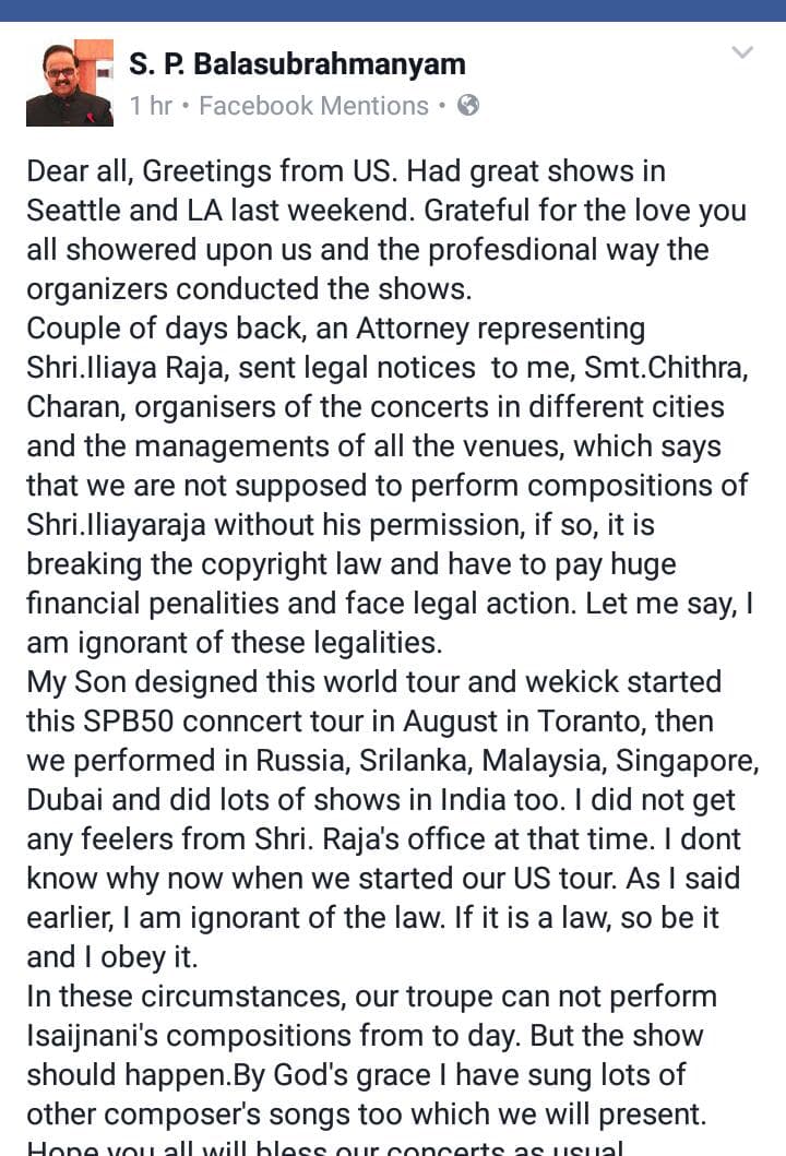 சில நாட்களுக்கு முன்பு, இளையராஜாவின் சார்பில் அவரது வழக்கறிஞர், எனக்கும், சரணுக்கும், பாடகி சித்ராவிற்கும், உலகளவில் கச்சேரியை நடத்தும் ஒருங்கிணைப்பாளர்களுக்கும் நோட்டீஸ் ஒன்றை அனுப்பியுள்ளார்.