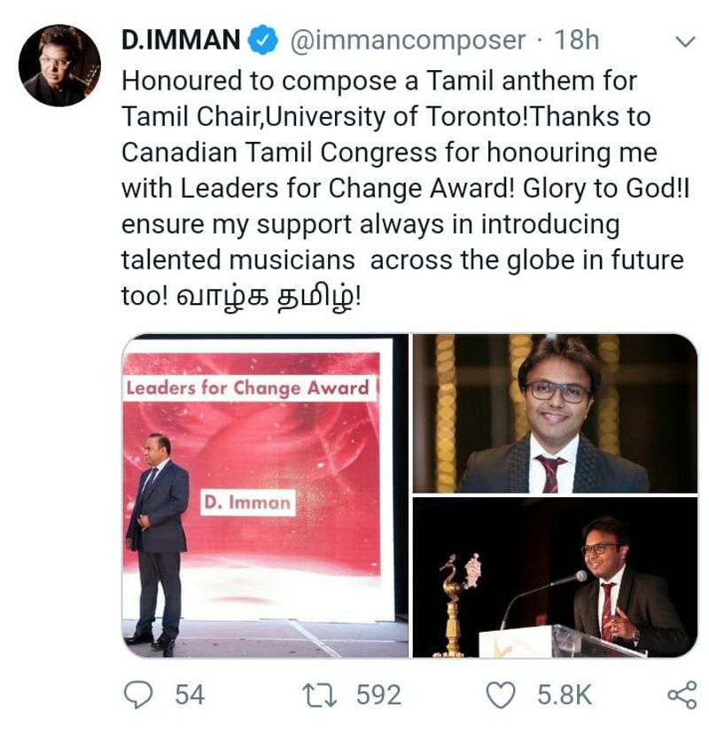 இதற்காககனடாவில்உள்ளதமிழ்காங்கிரஸ்அவருக்குமாற்றத்திற்கானதலைவர்விருதுவழங்கிக்கௌரவித்துள்ளது. விருதுபெற்றபுகைப்படத்தைத்தனதுட்விட்டரில்பதிவிட்டஇமான்தமிழ்காங்கிரஸிற்குத்தனதுநன்றியைத்தெரிவித்துள்ளார்.