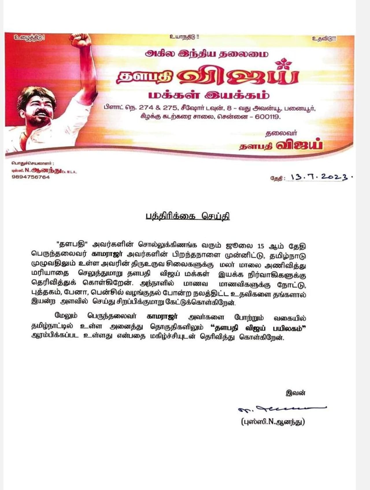 தற்போது விஜய் சார்பில், 'விஜய் மக்கள் இயக்க' பொதுச்செயலாளர் புஸ்ஸி ஆனந்த் பரபரப்பு அறிக்கை ஒன்றை வெளியிட்டுள்ளார். இந்த அறிக்கையில், கூறப்பட்டுள்ளதாவது... "தளபதி அவர்களின் சொல்லுக்கிணங்க வரும் ஜூலை 15ஆம் தேதி பெருந்தலைவர் காமராஜர் அவர்களின் பிறந்தநாளை முன்னிட்டு தமிழ்நாடு முழுவதிலும் உள்ள அவரின் திரு உருவ சிலைகளுக்கு, மலர் மாலை அணிவித்து மரியாதை செய்யுமாறு, தளபதி விஜய் மக்கள் இயக்க நிர்வாகிகளுக்கு தெரிவித்துக் கொள்கிறேன். அந்நாளில் மாணவ மாணவிகளுக்கு நோட்டு, புத்தகம், பேனா, பென்சில், வழங்குதல் போன்ற நலத்திட்ட உதவிகளை தங்களால் இயன்ற அளவில் செய்து சிறப்பிக்குமாறு கேட்டுக்கொள்கிறேன் என தெரிவித்துள்ளார்.