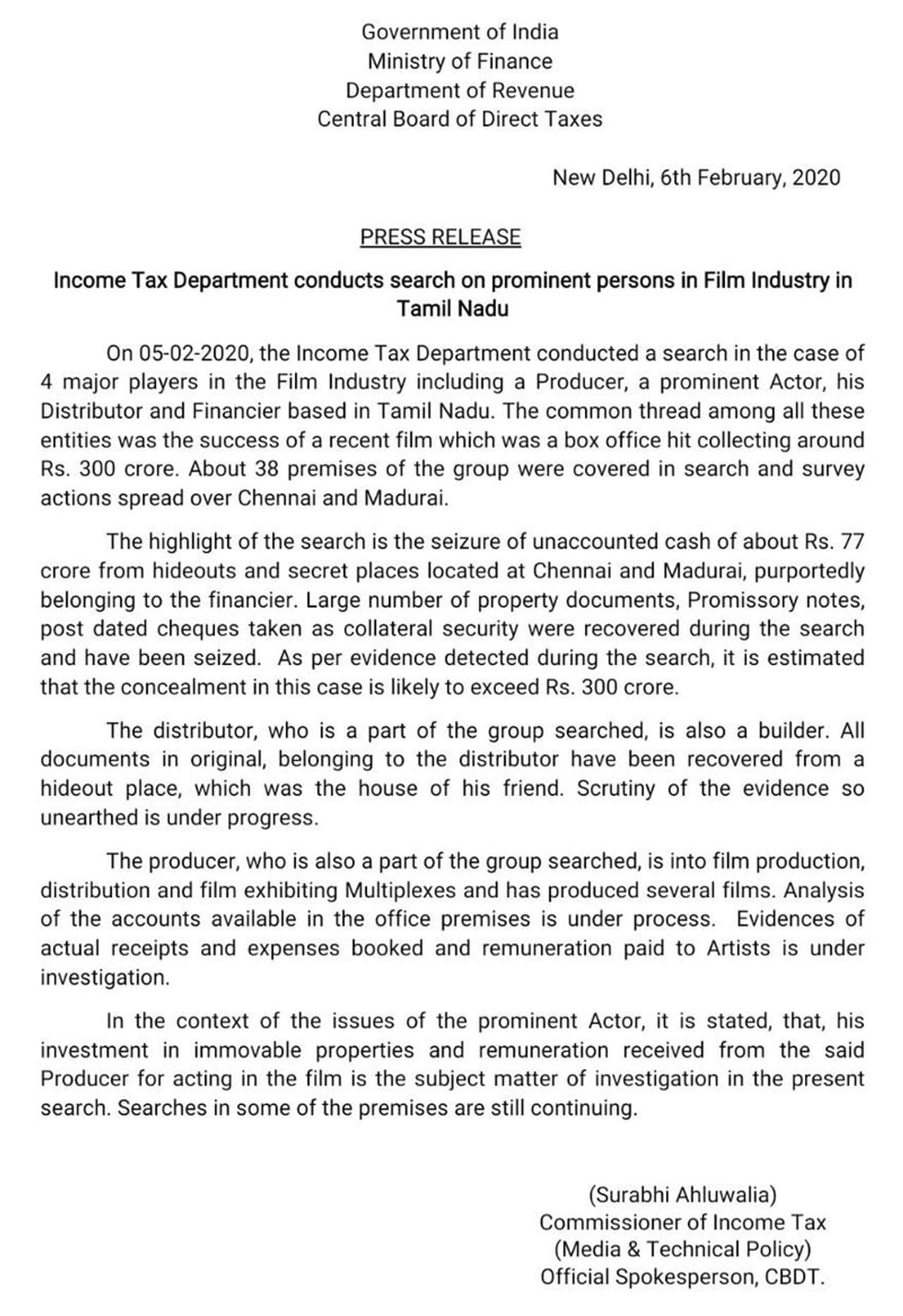 அதில் தமிழகத்தைச் சேர்ந்த ஒரு தயாரிப்பாளர், பிரபல நடிகர், அவரின் வினியோகஸ்தர் மற்றும் பைனான்சியர் ஆகியோருக்கு சொந்தமான இடங்களில் 05.02.2020 அன்று வருமான வரித்துறை சோதனை நடத்தியது. அண்மையில் வெளியாகி ரூ.300 கோடி வசூல் செய்த படம் தொடர்பாகத் தான் சோதனை நடைபெறுவதாக அறிக்கையில் வருமான வரித்துறை தெரிவித்துள்ளது.