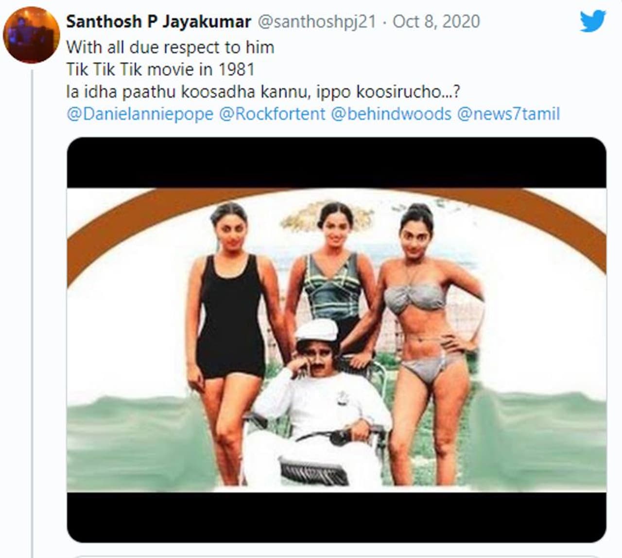 இதற்கு பதிலளித்த இரண்டாம் குத்து பட இயக்குநர் சந்தோஷ் பி ஜெயக்குமார். தனது ட்விட்டர் பக்கத்தில், பாரதிராஜா இயக்கிய “டிக் டிக் டிக்” பட போஸ்டரை பதிவிட்டு, “டி க் டிக் டிக்” கூசாத கண்ணு இப்ப கூசிருச்சோ” என பதிவிட்டிருந்தார். இந்த சம்பவம் சோசியல் மீடியாவை கொந்தளிக்க வைக்க நீயெல்லாம் பாரதிராஜாவை கேள்வி கேட்குறீயா? என நெட்டிசன்கள் வெளுத்து வாங்க ஆரம்பித்தனர்.