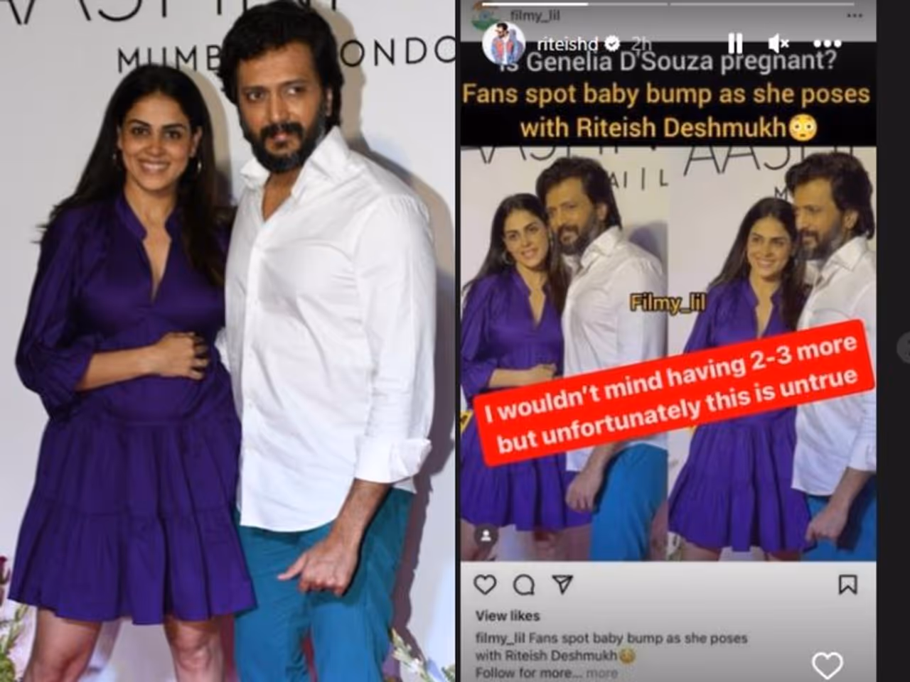 இந்த நிலையில் ஜெனிலியா கர்ப்பமாக இருப்பதாக சமூக வலைதளங்களில் தகவல்கள் வெளியான வண்ணம் இருந்தன. இந்த நிலையில் ஜெனிலியாவின் கணவர், ரித்தேஷ் தேஷ்முக், இந்த வதந்திகள் முற்றிலும் பொய்யானவை என்று விளக்கம் அளித்துள்ளார். மேலும் அதிக குழந்தைகளைப் பெறுவதைப் பொருட்படுத்தவில்லை என்றாலும், இந்த வதந்திகள் தவறானவை என்று அவர் தனது இன்ஸ்டா பக்கத்தில் பதிவிட்டுள்ளார். அவைர்ன் பதிவில். "இன்னும் 2-3 வைத்திருப்பதை நான் பொருட்படுத்த மாட்டேன், ஆனால் துரதிர்ஷ்டவசமாக இது பொய்யானது" என்று குறிப்பிட்டுள்ளார்.