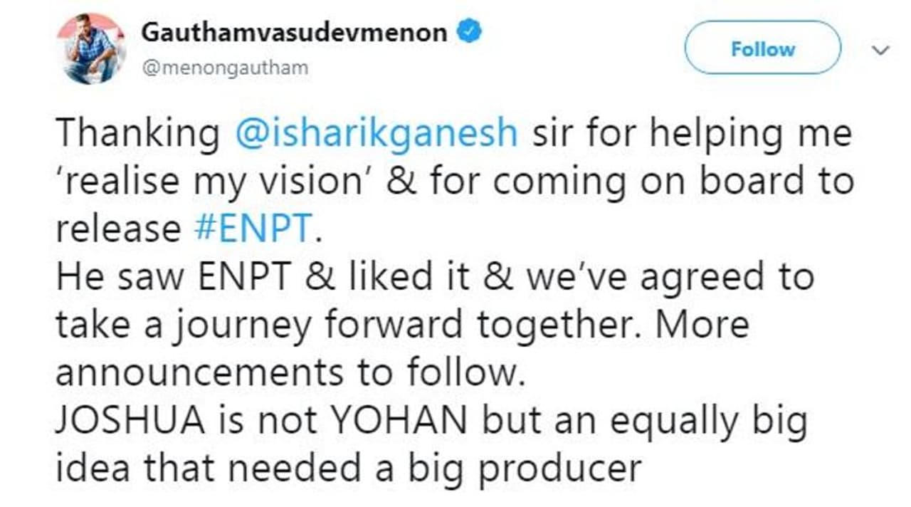 ஒரே நாளில் அடுத்தடுத்து அப்டேட்களை கொடுத்து ரசிகர்களை திக்குமுக்கடாச் செய்துள்ள கவுதம் மேனன், 'எனை நோக்கி பாயும் தோட்டா' படத்தை ரிலீஸ் செய்ய உதவிய ஐசரி கணேசுக்கு நன்றி தெரிவித்துள்ளார். மேலும், அவரது தயாரிப்பில் தான் இயக்கும் புதிய படமான 'ஜோஸ்வா இமை போல் காக்க' படம், விஜய் நடிக்கவிருந்த யோஹன் படத்தின் கதை இல்லை என்றும் தெளிவுப்படுத்தியுள்ளார்.