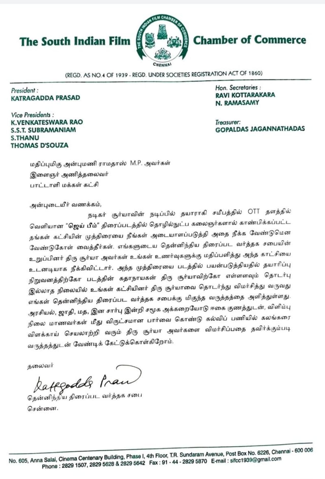 இந்த விஷயத்தில் திரையுலகம் அமைதியாக இருப்பதாகவும் பலர் விமர்சித்தனர். இந்நிலையில் தென்னிந்திய திரைப்பட வர்த்தகச் சபை தலைவர் கட்ரகாட்டா பிரசாத், பாமக இளைஞரணி தலைவர் அன்புமணி ராமதாஸுக்கு எழுதியுள்ள கடிதத்தில், “நடிகர் சூர்யாவின் நடிப்பில் தயாராகி சமீபத்தில் ஓடிடி தளத்தில் வெளியான ‘ஜெய்பீம்’ திரைப்படத்தில் தொழில்நுட்பக் கலைஞர்களால் காண்பிக்கப்பட்ட தங்கள் கட்சியின் முத்திரையை நீங்கள் அடையாளப்படுத்தி அதை நீக்க வேண்டும் என வேண்டுகோள் வைத்தீர்கள். எங்களுடைய தென்னிந்திய திரைப்பட வர்த்தகச் சபையில் உறுப்பினர் சூர்யா, உங்கள் உணர்வுகளுக்கு மதிப்பளித்து அந்தக் காட்சியை உடனடியாக நீக்கிவிட்டார்.