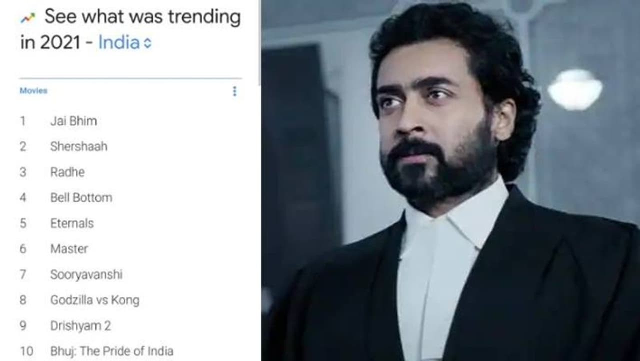 சூர்யாவின் சூரரைப் போற்று திரைப்படம் கடந்தாண்டு இரண்டாவது இடத்தை பிடித்திருந்த நிலையில், இந்தாண்டு அவர் நடித்த ஜெய் பீம் படம் கூகுள் தேடலில் முதல் இடத்தை பிடித்துள்ளது.