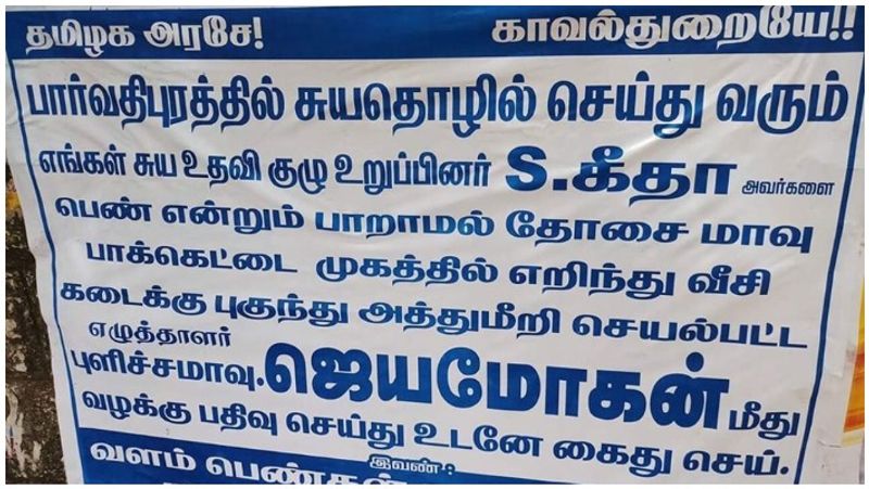 இன்று நகரம் முழுக்க ஒட்டப்பட்டுள்ள போஸ்டர்களில் ,...தமிழக அரசே காவல்துறையே ...பார்வதிபுரத்தில் சுய உதவித் தொழில் செய்துவரும் எங்கள் சுய உதவி குழு உறுப்பினரை பெண் என்றும் பாராமல் தாக்கிய புளிச்சமாவு ஜெயமோகனை உடனே கைது செய் என்று எழுதப்பட்டுள்ளது.