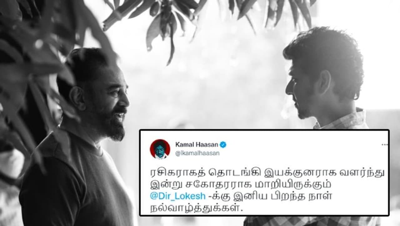 இந்நிலையில், இன்று பிறந்தநாள் கொண்டாடும் இயக்குனர் லோகேஷ் கனகராஜுக்கு சமூக வலைதளங்களில் வாழ்த்துக்கள் குவிந்த வண்ணம் உள்ளது. அதன்படி நடிகர் கமல்ஹாசன் அவரை வாழ்த்தி தனது டுவிட்டர் பக்கத்தில் பதிவிட்டுள்ளதாவது: “ரசிகராகத் தொடங்கி... இயக்குனராக வளர்ந்து... இன்று சகோதரராக மாறியிருக்கும் இயக்குனர் லோகேஷ் கனகராஜுக்கு இனிய பிறந்த நாள் நல்வாழ்த்துக்கள்” என பதிவிட்டுள்ளார்.