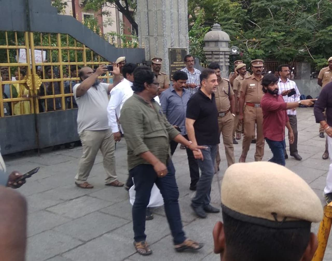 பல்கலை கழகத்திற்குள் செல்ல கமல் ஹாசனுக்கு அனுமதி மறுக்கப்பட்டது. அதனால் பூட்டப்பட்ட பல்கலைக்கழக கேட்டின் முன்பு நின்றபடியே, மாணவர்களை சந்தித்த கமல் ஹாசன், போராட்டத்திற்கு தனது ஆதரவை தெரிவித்தார். நம்மவரின் இந்த வருகை மாணவர்களின் இடையே உத்வேகத்தை ஏற்படுத்தியுள்ளது.