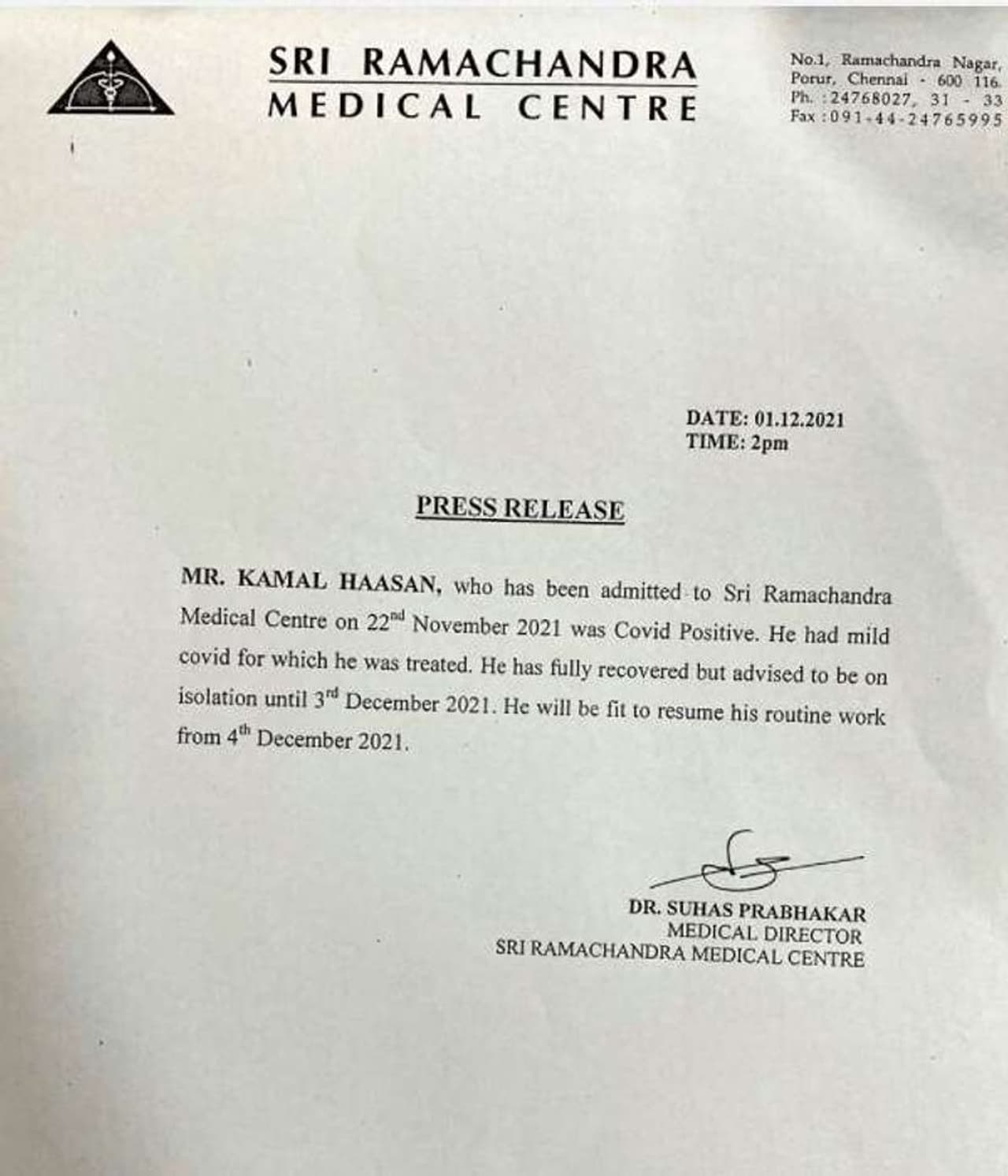அதன்படி நடிகர் கமல்ஹாசன் கொரோனாவில் இருந்து முழுமையாக குணமடைந்து விட்டதாகவும், வருகிற டிசம்பர் 3-ந் தேதி வரை அவர் தனிமைப்படுத்தப்பட்டு இருப்பார் என்றும், டிசம்பர் 4-ந் தேதி முதல் தனது அன்றாடப் பணியை தொடங்குவார் என்றும் குறிப்பிடப்பட்டு உள்ளது.