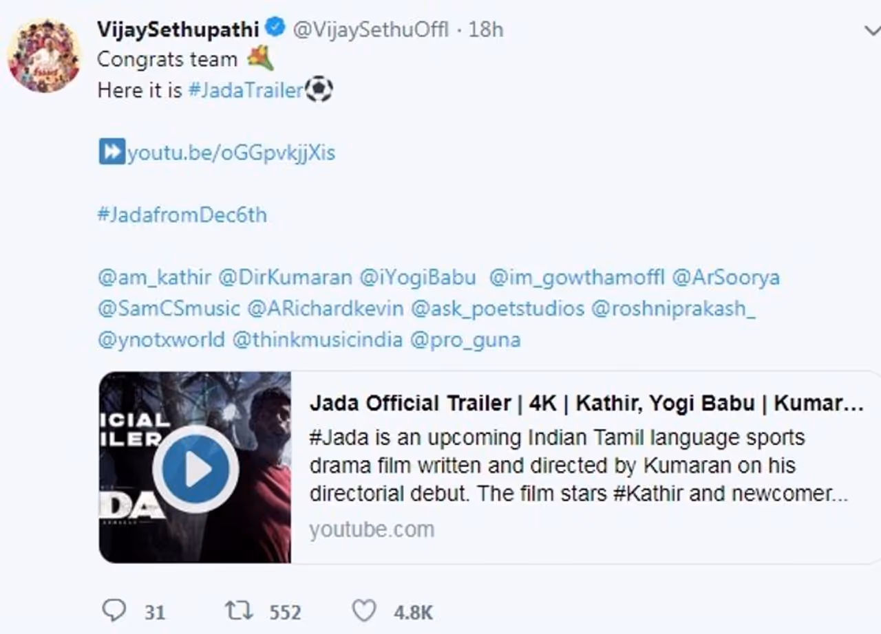 இதனையடுத்து படத்தின் ப்ரமோஷன் பணிகளை தீவிரப்படுத்தியுள்ள படக்குழு, தற்போது 'ஜடா 'டிரைலரை வெளியிட்டுள்ளது. இதனை 'மக்கள் செல்வன்' விஜய்சேதுபதி, தனது டுவிட்டர் பக்கத்தில் வெளியிட்டு படக்குழுவுக்கு வாழ்த்து தெரிவித்துள்ளார்.