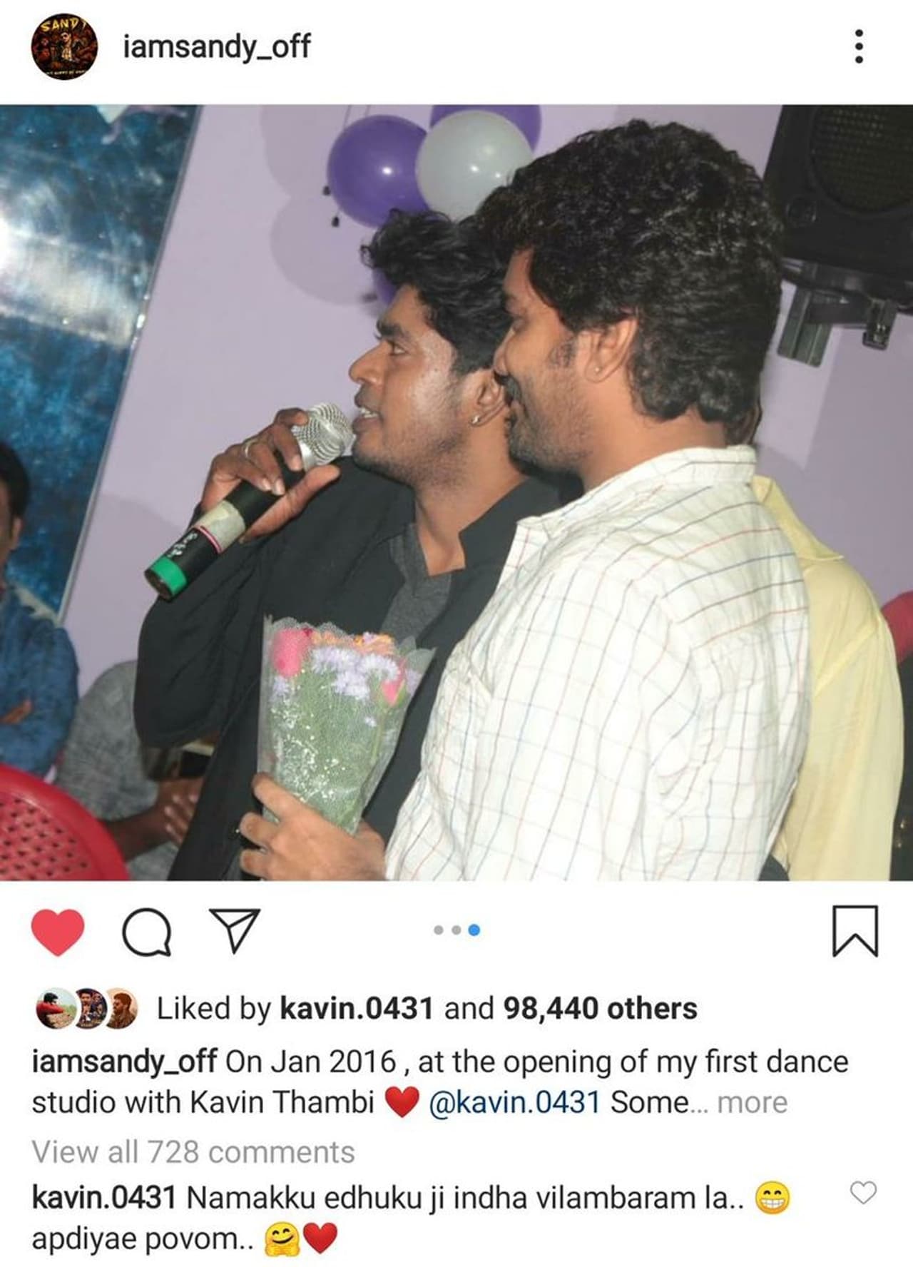 அதில், "கடந்த ஜனவரி 2016 ஆம் ஆண்டு என்னுடைய முதல் டான்ஸ் ஸ்டுடியோவின் திறப்பு விழாவில் கவின் தம்பியுடன்! சில உறவுகள் எப்பொழுதும் மாறாது" என்பது போல் குறிப்பிட்டிருந்தார்.
