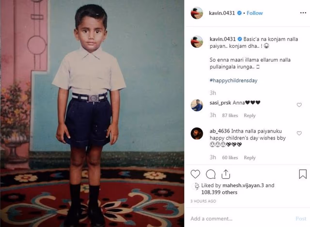 இந்நிலையில், குழந்தைகள் தினத்தை முன்னிட்டு, கவின் தனது இன்ஸ்டாகிராம் பக்கத்தில் தன்னுடைய சிறுவயது போட்டோவை பகிர்ந்துள்ளார். அந்த பதிவில், பேஸிக்கா நான் நல்ல பையன்.. கொஞ்சம் தா... என்னை மாதிரி இல்லாம எல்லோரும் நல்ல புள்ளைங்களா இருங்க. குழந்தைகள் தின வாழ்த்துகள்'' என்று கவின் தெரிவித்துள்ளார்.