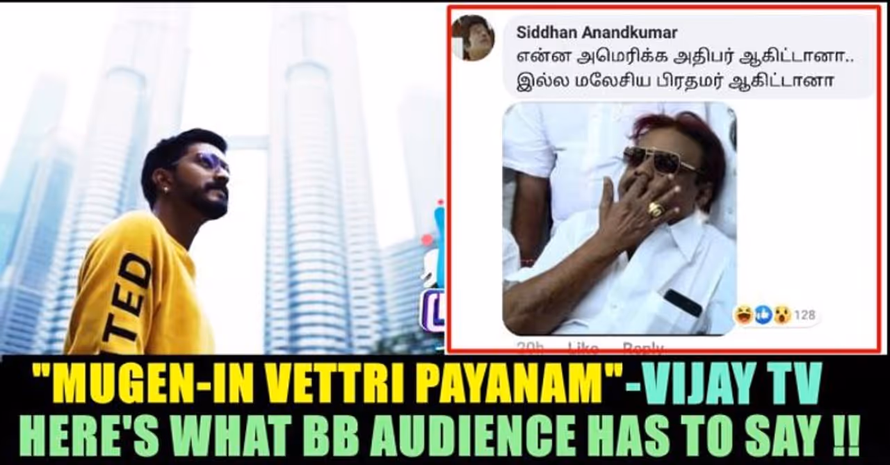 இறுதியாக பிக்பாஸ் வின்னராக மலேசிய பாடகர் முகேன் தேர்வு செய்யப்பட்டார். இதனையடுத்து சூப்பர் சிங்கர் உள்ளிட்டபல நிகழ்ச்சிகளை முகேனை வைத்து விஜய் டி.வி. நடத்தி வருகிறது. தற்போது "முகேனின் வெற்றிப்பயணம்" என்ற தலைப்பில் விஜய் டி.வி. புதிய நிகழ்ச்சி ஒன்றை ஒளிபரப்ப உள்ளது. நாளை முதல் ஒளிபரப்பாக உள்ள அந்த நிகழ்ச்சி குறித்து ட்விட்டரில் விஜய் டி.வி. வெளியிட்ட புரோமோவை நெட்டிசன்கள் மரண பங்கம் செய்துவருகின்றனர்.