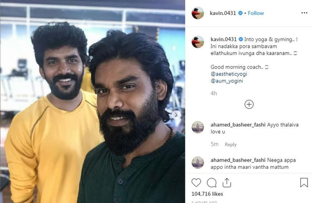 ஜிம்மில் தன்னுடைய பயிற்சியாளருடன் இருக்கும் இந்த புகைப்படங்களை, கவின் தன்னுடைய இன்ஸ்டாகிராம் பக்கத்தில் பகிர்ந்துள்ளார். "இனி நடக்கப்போற சம்பவம் எல்லாத்துக்கும் இவுங்கதா காரணம்... குட் மார்னிங் கோச்..." என்ற கேப்சனுடன் கவின் பகிர்ந்துள்ள இந்த பகைப்படங்களைப் பார்த்த கவின் ஆர்மியினர் உற்சாகத்தில் சமூக வலைதளத்தையே அதகளப்படுத்தி வருகின்றனர்.