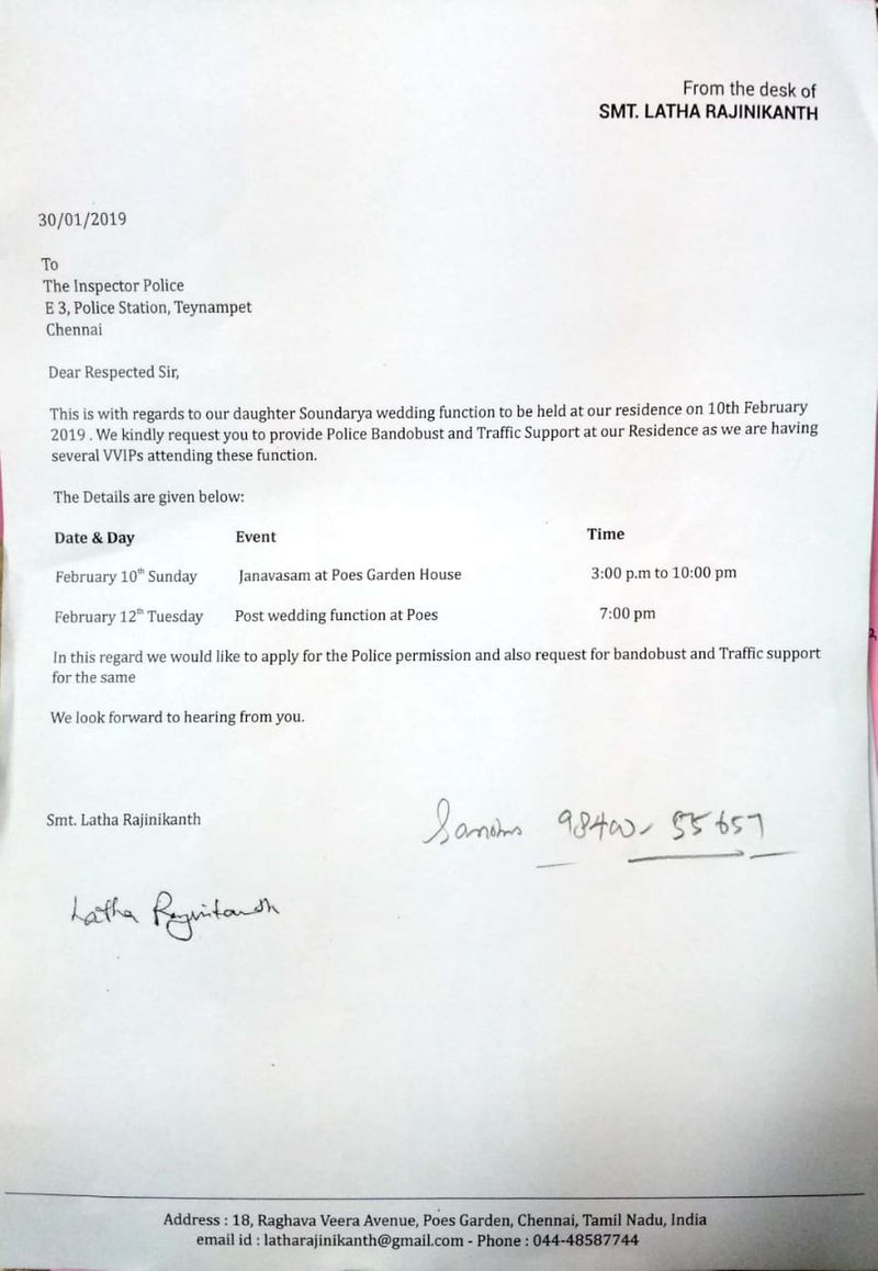 இந்நிலையில், கல்யாணம் இன்னும் பத்து நாட்கள் உள்ள நிலையில் ரஜினிகாந்த் மனைவி லதா ரஜினிகாந்த் அவசர அவசரமாக சென்னை தேனாம்பேட்டை E3 காவல் நிலையத்திற்கு வந்த அவர் ஒரு மனு கொடுத்துள்ளார். அதில், வரும் 10 ஆம் தேதி எங்களது மகள் திருமணம் போயஸ் கார்டன் வீட்டில் நடைபெற இருப்பதால் இந்த கல்யாண விழாவில் சினிமா நட்சத்திரங்கள், அரசியல் பிரமுகர்கள், தொழிலதிபர்கள் கலந்து கொள்கிறார்கள் எனவே அவர்களுக்கு உரிய பாதுகாப்பு வழங்குமாறு கேட்டுள்ளார்.