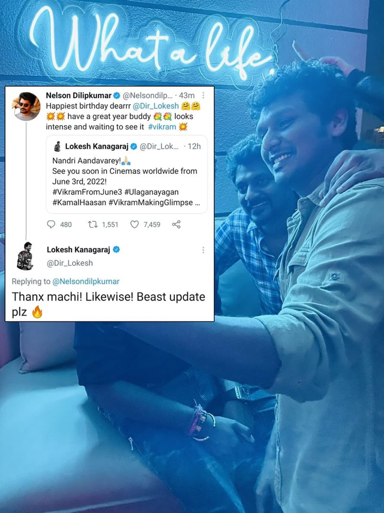 இயக்குனர் லோகேஷ் கனகராஜின் பிறந்தநாளான நேற்று விக்ரம் படத்தின் ரிலீஸ் தேதியுடன் கூடிய கிளிம்ப்ஸ் வீடியோவை படக்குழு வெளியிட்டிருந்தது. பிரபலங்கள் பலரும் லோகேஷுக்கு வாழ்த்துக்களை தெரிவித்தனர். அந்த வகையில், பீஸ்ட் படத்தின் இயக்குனர் நெல்சன், டுவிட்டர் வாயிலாக லோகேஷுக்கு பிறந்தநாள் வாழ்த்து தெரிவித்தார். இதற்கு நன்றி தெரிவித்த லோகேஷ், பீஸ்ட் அப்டேட் விடுமாறு கேட்டார். இதைப்பார்த்த விஜய் ரசிகர்கள், நெல்சனிடம் பீஸ்ட் அப்டேட் வெளியிடுமாறு கேட்டு வருகின்றனர்.