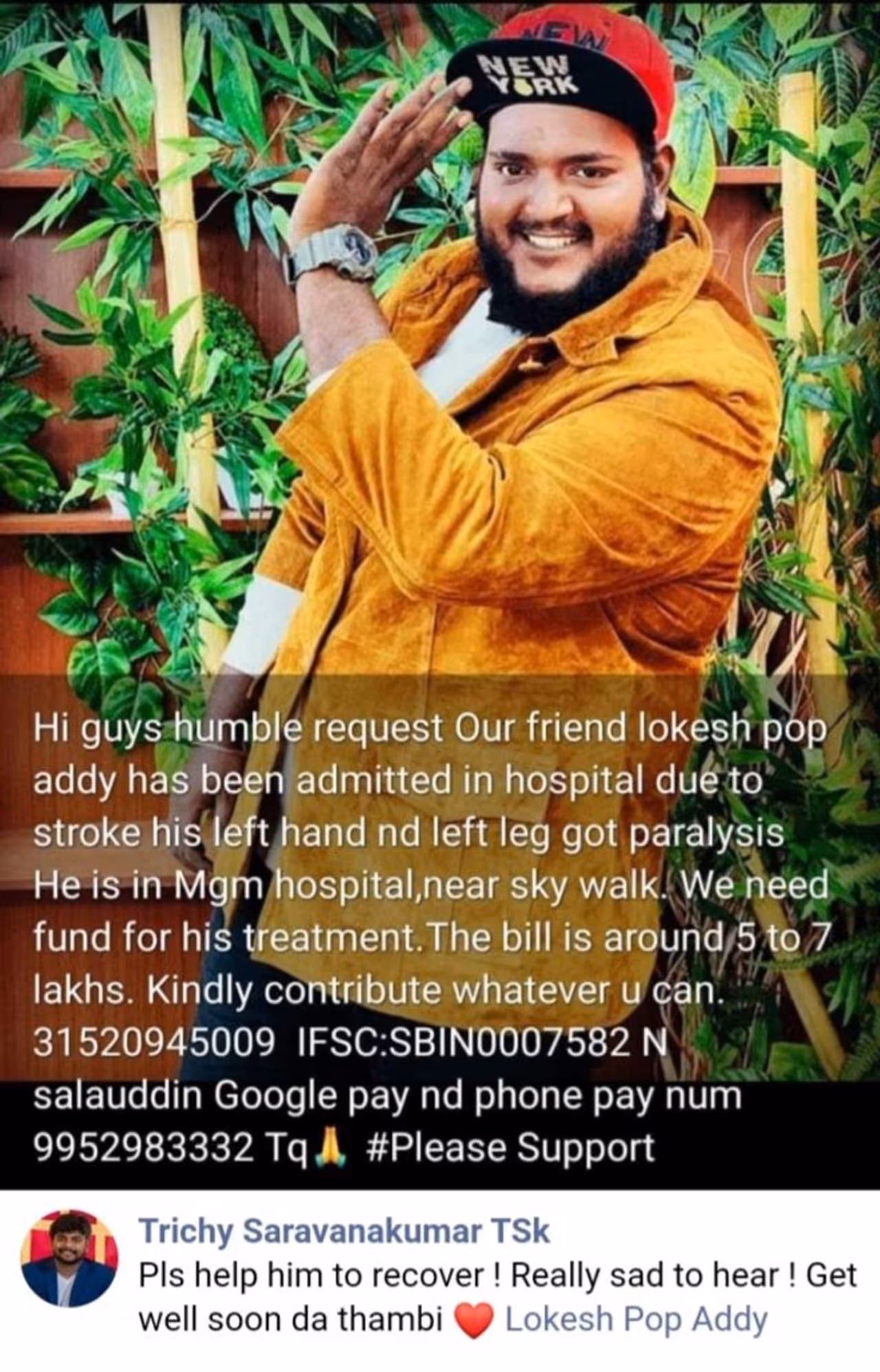 இந்நிலையில் இவருக்கு திடீர் என கை - கால் செயலிழப்பு ஏற்பட்டதால் அவரை உடனடியாக மருத்துவமனையில் சேர்த்து சிகிச்சை அளித்துள்ளனர். மேலும் அவருடைய மருத்துவ செலவிற்கு 7 லட்சம் வரை பணம் செலவாகும் என மருத்துவர்கள் தெரிவித்ததால், அவருடைய நண்பர்கள் சமூக வலைத்தளத்தில் அவர் புகைப்படத்துடன் கூட செய்தியை வெளியிட்டு பண உதவி கேட்டு வருகிறார்கள். இவரின் இந்த நிலை இவருடைய ரசிகர்களை சோகத்தில் மூழ்கடித்துள்ளது.