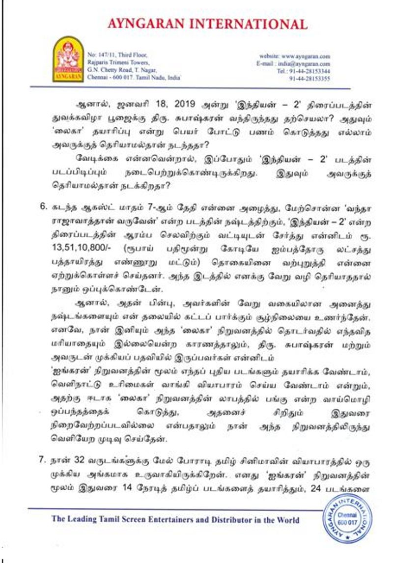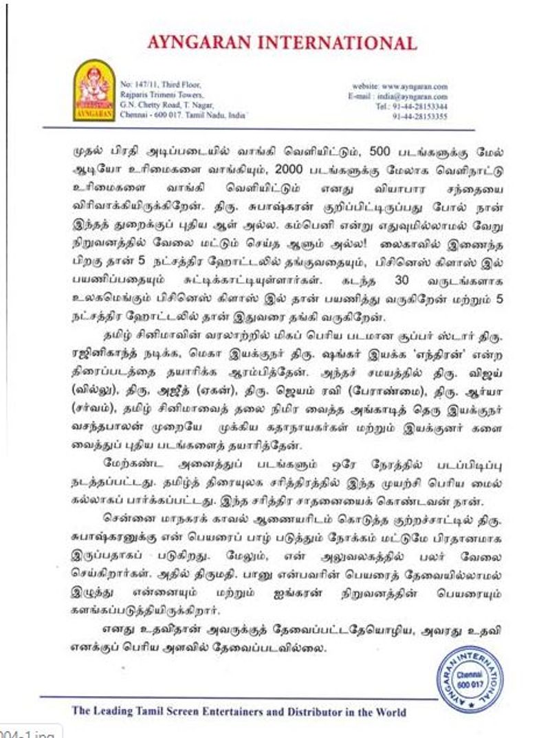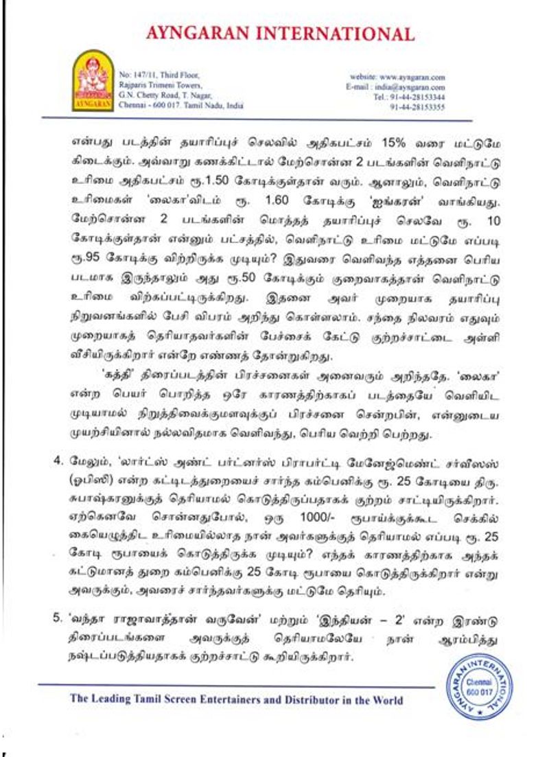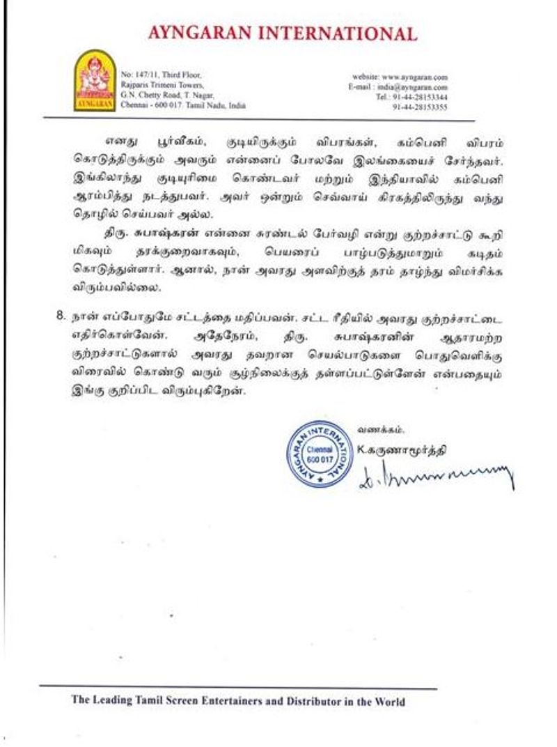 இதுகுறித்து அவர் வெளியிட்டுள்ள 5 பக்க அறிக்கையில்,...எனது பூர்வீகம் குடியிருக்கும் விபரங்கள் கம்பெனி விபரம் கொடுத்திருக்கும் அவரும் என்னைப்போலவே இலங்கையைச் சேர்ந்தவர் இங்கிலாந்து குடியுரிமை பெற்றவர் மற்றும் இந்தியாவில் கம்பெனி ஆரம்பித்து நடத்துபவர். அவர் ஒன்றும் செவ்வாய் கிரகத்திலிருந்து வந்து தொழில் செய்பவர் அல்ல. சுபாஷ்கரன் என்னை சுரண்டல் பேர்வழி என்று குற்றச்சாட்டு கூறி மிகவும் தரக்குறைவாகவும் பெயரை பாழ்படுத்துமாறும் கடிதம் கொடுத்துள்ளார்.