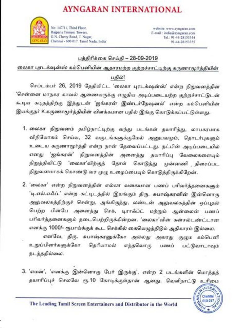 லைகா நிறுவன அதிபர் சுபாஷ்கரன் தனது நிறுவனத்தில் பணியாற்றிய லண்டன் கருணாமூர்த்தி 120 கோடிக்கும் மேல் மோசடி செய்துவிட்டார் என்று நேற்று சென்னை கமிஷனர் அலுவலகத்தில் புகார் செய்திருந்த நிலையில் அவரது அத்தனை புகார்களுக்கும் மறுப்பு தெர்வித்து சூடான மறுப்பு அறிக்கை வெளியிட்டிருக்கிறார் கருணா.