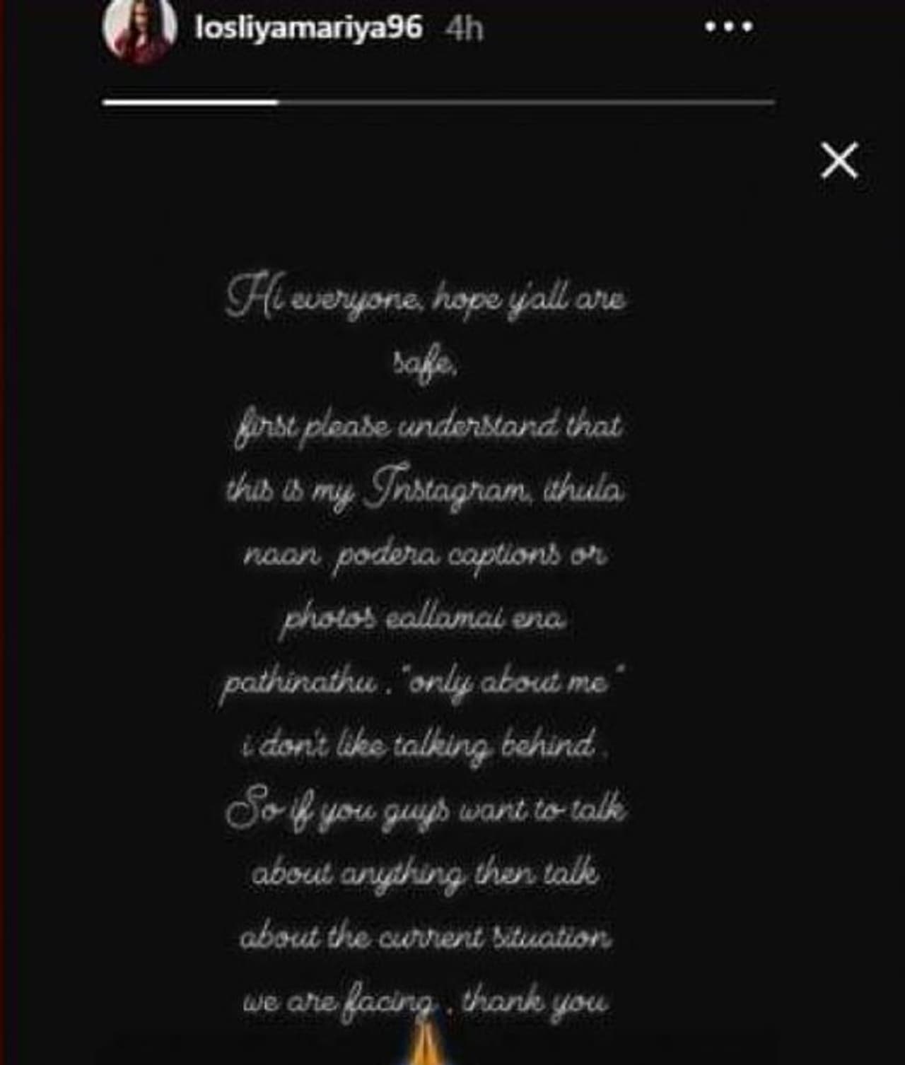 இதனை சற்றும் எதிர்பார்க்காத லாஸ்லியா கவின் பற்றி பேசியதால் கடுப்பாகி, இப்பொது இதுகுறித்து கோவமாக விளக்கம் கொடுத்துள்ளார். அதில், "இது என்னுடைய இன்ஸ்டாகிராம் பக்கம், நான் போடுகிற வார்த்தைகள், புகைப்படங்கள் எல்லாமே என்னை பற்றியது. பின்னால் சென்று யாரையும் பற்றி பேச வேண்டிய அவசியம் இல்லை. தன்னுடைய தற்போதைய சூழ்நிலை பற்றி தான் பேசியதாகவும் அதனை நானே பார்த்து கொள்வேன் என தெரிவித்துள்ளார்.