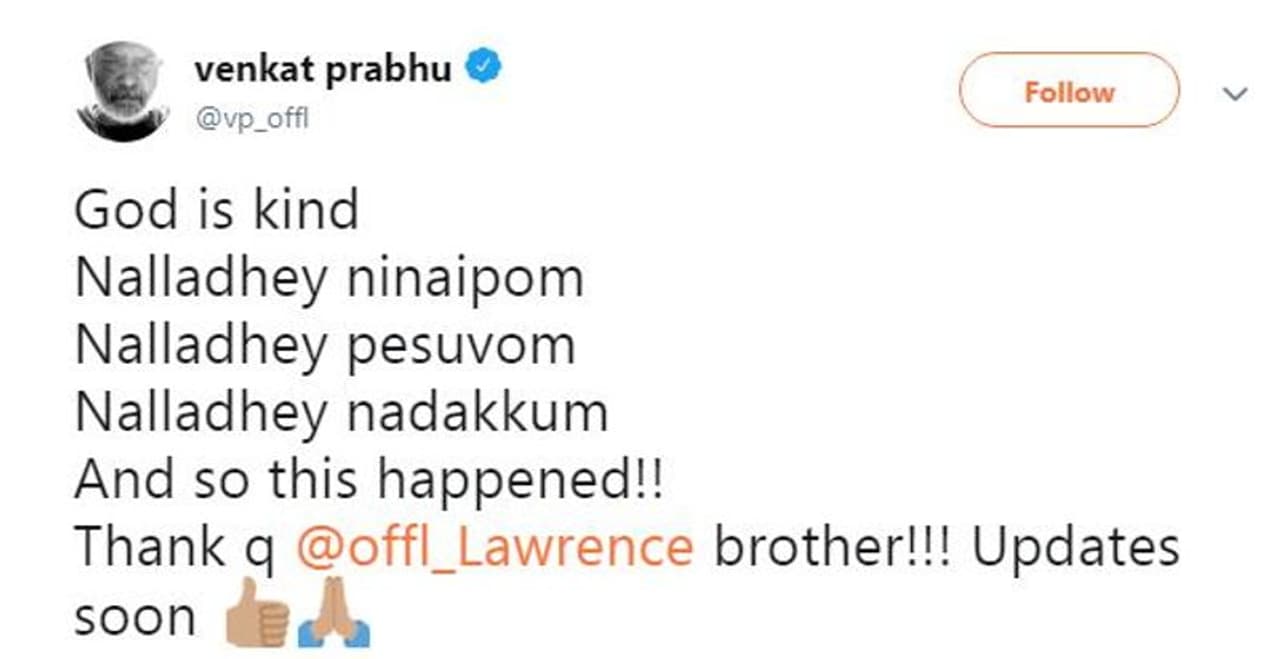 இதனை உறுதி செய்யும் விதமாக, ராகவா லாரன்ஸ் உடன் எடுக்கப்பட்ட புகைப்படத்தை ட்விட்டர் பக்கத்தில் பகிர்ந்துள்ள இயக்குநர் வெங்கட் பிரபு, “கடவுள் அன்பானவர், நல்லதே நினைப்போம். நல்லதே பேசுவோம். நல்லதே நடக்கும். எனவே இது நடைபெற்றுள்ளது. லாரன்ஸ் பிரதருக்கு நன்றி. விரைவில் அப்டேட் வரும்” என்று கூறியுள்ளார்.