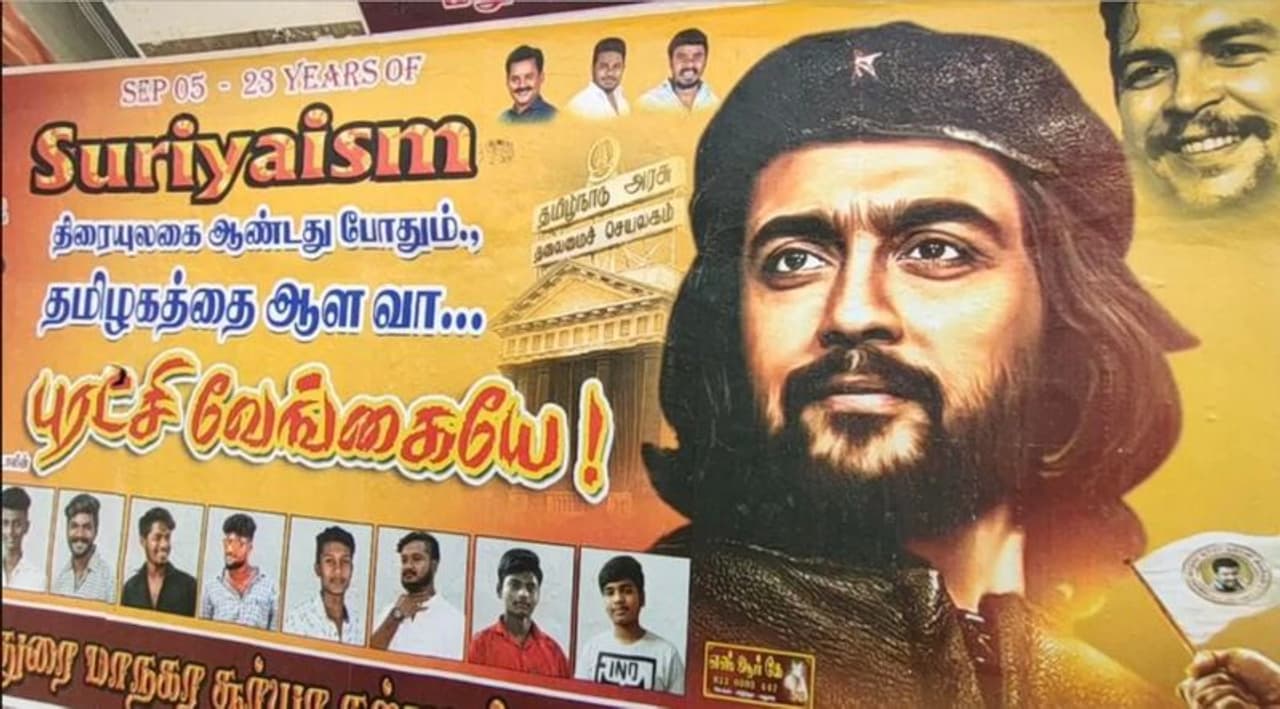 விஜய் ரசிகர்கள் விவேகானந்தர், எம்.ஜி.ஆர். என யோசித்தால் சூர்யா ரசிகர்கள் ஒரு படி மேலே போய் அவருக்கு சேகுவேரா கெட்டப் போட்டு போஸ்டர் ஓட்டியுள்ளனர். அத்துடன் “திரையுலகை ஆண்டது போதும்... தமிழகத்தை ஆள வா புரட்சி வேங்கையே...!” என்று வாசகங்கள் எல்லாம் போட்டு வேற லெவலுக்கு வெறியேற்றியுள்ளனர். இந்த போஸ்டர் யுத்தம் அடுத்து எங்க கொண்டு போய் விடப்போகுதோ தெரியல...