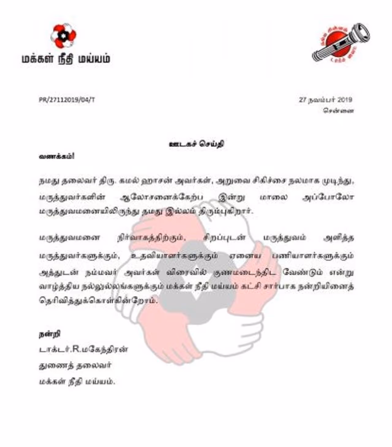 அறுவை சிகிச்சைக்கு பின் கமலஹாசன் எப்படி இருக்கிறார் என்பதை ரசிகர்களுக்கும், மக்கள் நீதி மய்யம் நிர்வாகிகளுக்கும் தெரிவிக்கும் விதமாக, அறிக்கை ஒன்று வெளியிடப்பட்டுள்ளது.