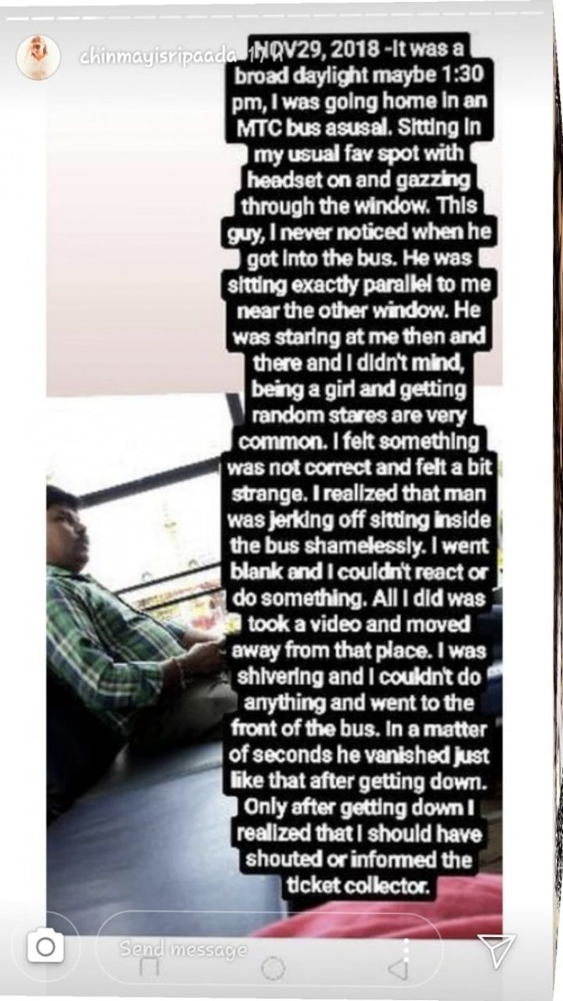 இந்த நிலையில் சென்னை கேளம்பாக்கத்திலிருந்து சோளிங்கநல்லூருக்கு செல்லும் பேருந்தில் ஒரு நபர் ஒருவர் அங்கிருந்த பெண்களை வெறித்து பார்த்தபடி வெக்கமின்றி பொதுவெளியில் சுய இன்பம் அனுபவித்து கொண்டிருந்ததாகவும். இதை ஒரு பெண் புகைப்படம் எடுத்து இன்ஸ்டாங்க்ராமில் பதிவிட்டுள்ளதாக கூறி சின்மயி அதனை ஷேர் செய்துள்ளார்.