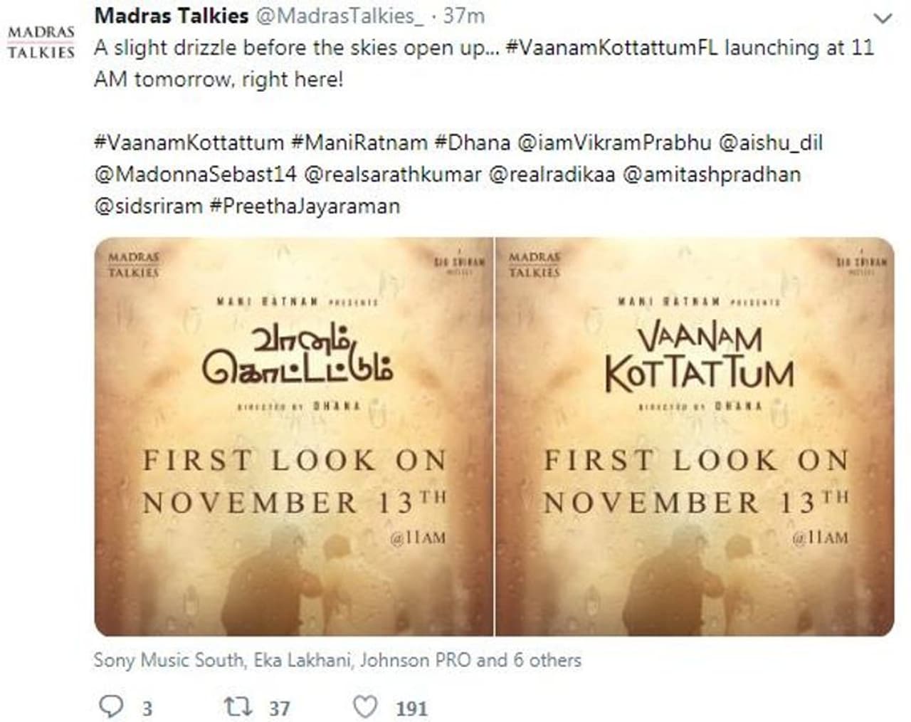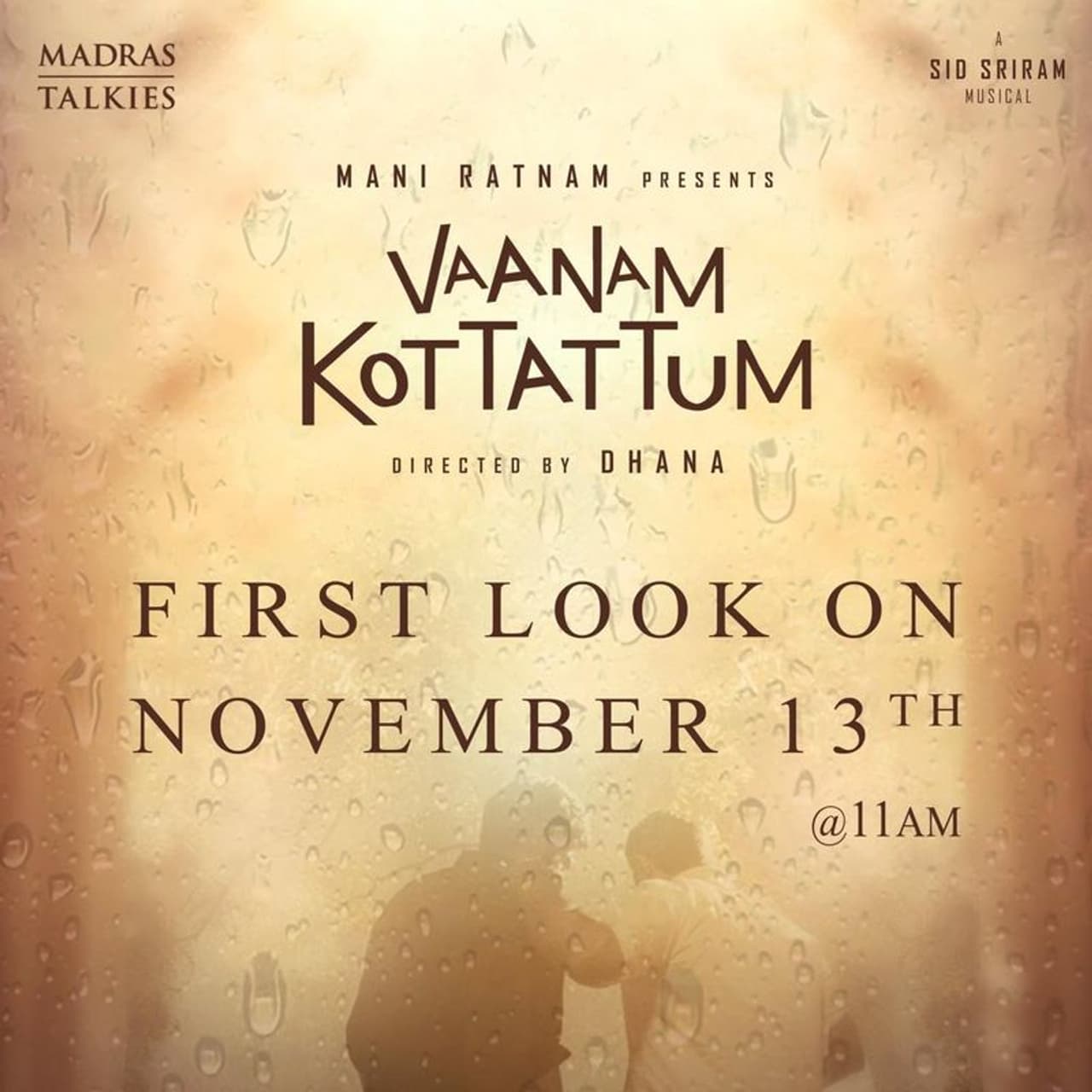 இதனைத் தொடர்ந்து, படத்தின் ஃபர்ஸ்ட் லுக், இன்று நவம்பர் 13ம் தேதி காலை 11 மணிக்கு வெளியாகும் என படக்குழு அறிவித்துள்ளது. முதலில் டைட்டில், அடுத்து ஃபர்ஸ்ட் லுக் பற்றிய அறிவிப்பு என ஒரே நாளில் அடுத்தடுத்து சர்ப்ரைஸ் கொடுத்து ரசிகர்களை திக்குமுக்கடாச் செய்துள்ளார் இயக்குநர் மணிரத்னம். மேலும், விரைவில் 'வானம் கொட்டட்டும்' படத்தின் பாடல்கள் வெளியாகவுள்ளதாகவும், சித்ஸ்ரீராமின் இசையை ரசிக்க தயராக இருங்கள் என்றும் படக்குழு தெரிவித்துள்ளது.