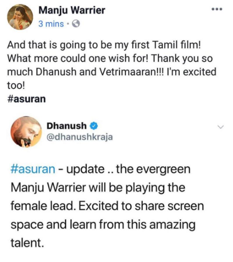 இந்நிலையில் தற்போது தனுஷ் நடிப்பில் இயக்குனர் வெற்றி மாறன் இயக்க உள்ள, "அசுரன்" படத்தின் மூலம் தமிழில் மஞ்சு வாரியார் அறிமுகமாக உள்ளதாக தகவல் வெளியானது.