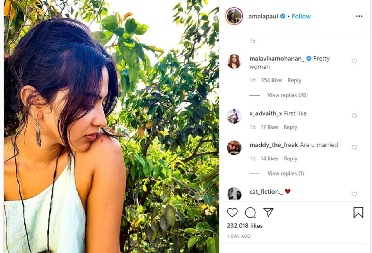 யாருக்குமே புரியாதபடி அமலா பால் போட்டுள்ள இந்த இன்ஸ்டா பதிவின் அர்த்தம், நம்ம “மாஸ்டர்” நாயகி மாளவிகா மோகனனுக்கு மட்டும் புரிந்து விட்டது போல் தெரிகிறது. உடனே Pretty Women என்று அமலா பாலை வர்ணித்து கமெண்ட் செய்துள்ளார். ஒரு நடிகை இன்னொரு நடிகையை அழகு என புகழ்வது நடக்க கூடிய காரணமா?... அதனால் தான் மாளவிகா மோகனனின் இந்த கமெண்ட் செம்ம வைரலாகி வருகிறது.