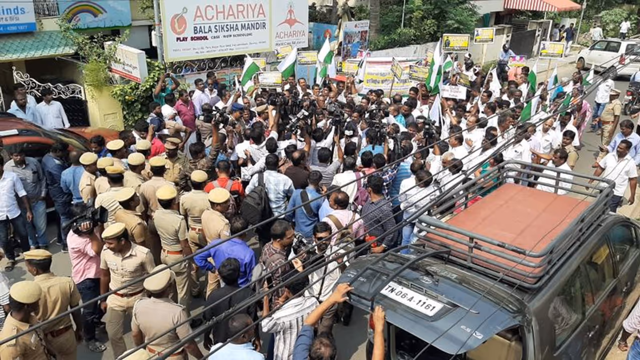 இதனையடுத்து அவரது வீடு மற்றும் அலுவலகத்திற்கு பலத்த போலீஸ் பாதுகாப்பு போடப்பட்டிருந்தது. இந்நிலையில் அவர்கள் அறிவித்தபடி, விருகம்பாக்கத்தில் உள்ள அவரது அலுவலகத்தை முற்றுகையிட்டு இன்று போராட்டத்தில் ஈடுபட்டனர். இதனால் அப்பகுதியில் கடுமையான போக்குவரத்து நெரிசல் ஏற்பட்டது. ஏராளமான வணிகர்கள் ஒரே இடத்தில் குவிந்ததால் அங்கு பதற்றம் ஏற்பட்டது. முற்றுகையில் ஈடுபட்டவர்கள் விஜய் சேதுபதிக்கு எதிராக முழக்கங்களை எழுப்பியதுடன் , விஜய்சேதுபதிக்கு எதிராக கண்டன குரல் எழுப்பினர்.