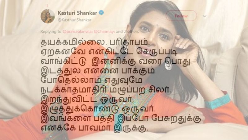 கடந்த சில தினங்களாகவே MeToo' பதிவுகள் சிலவற்றை பூடகமாக வெளியிட்டுவரும் கஸ்தூரி இதுவரை உருப்படியாக ஒருவர் பெயரையும் சொன்னதில்லை. அதன் தொடர்ச்சியாக இன்றும் பரபரப்பு கிளப்புகிறேன் பேர்வழி என்று ‘ஏற்கனவே என்னிடம் செருப்படி வாங்கிவிட்டு எதுவுமே நடக்காதமாதிரி மழுப்புற சிலர்...இறந்துவிட்ட ஒருவர்...இழுத்துக்கொண்டு இருக்கிற ஒருவர்...இவங்களைப் பத்தி இப்போ பேசுறதுக்கு எனக்கே பாவமா இருக்கு...’ என்று ட்விட்டியிருக்கிறார்.