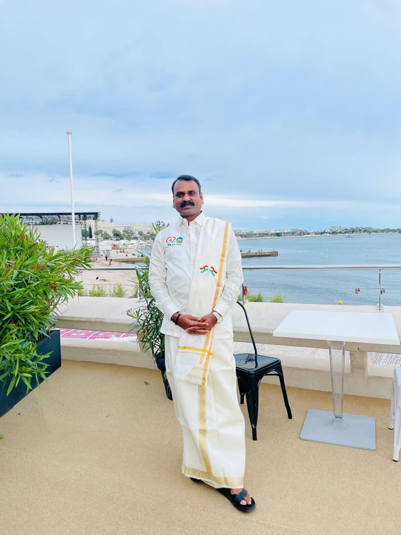 பல்வேறு நாட்டை சேர்ந்த பிரபலங்கள் கலந்து கொள்ளும் இந்த கேன்ஸ் திரைப்பட விழாவின் தொடக்க நாளான இன்று சிவப்புக் கம்பளத்தில், தமிழ்ப் பாரம்பரிய உடையான பட்டு ‘வேஷ்டி’ அணிந்து, தேசிய கோடி பதித்த உடையில்... அங்கவஸ்திரத்துடன் தென்னிந்திய மற்றும் தமிழகத்தின் கலாசாரத்தை எல். முருகன் வெளிப்படுத்தியுள்ளார்.