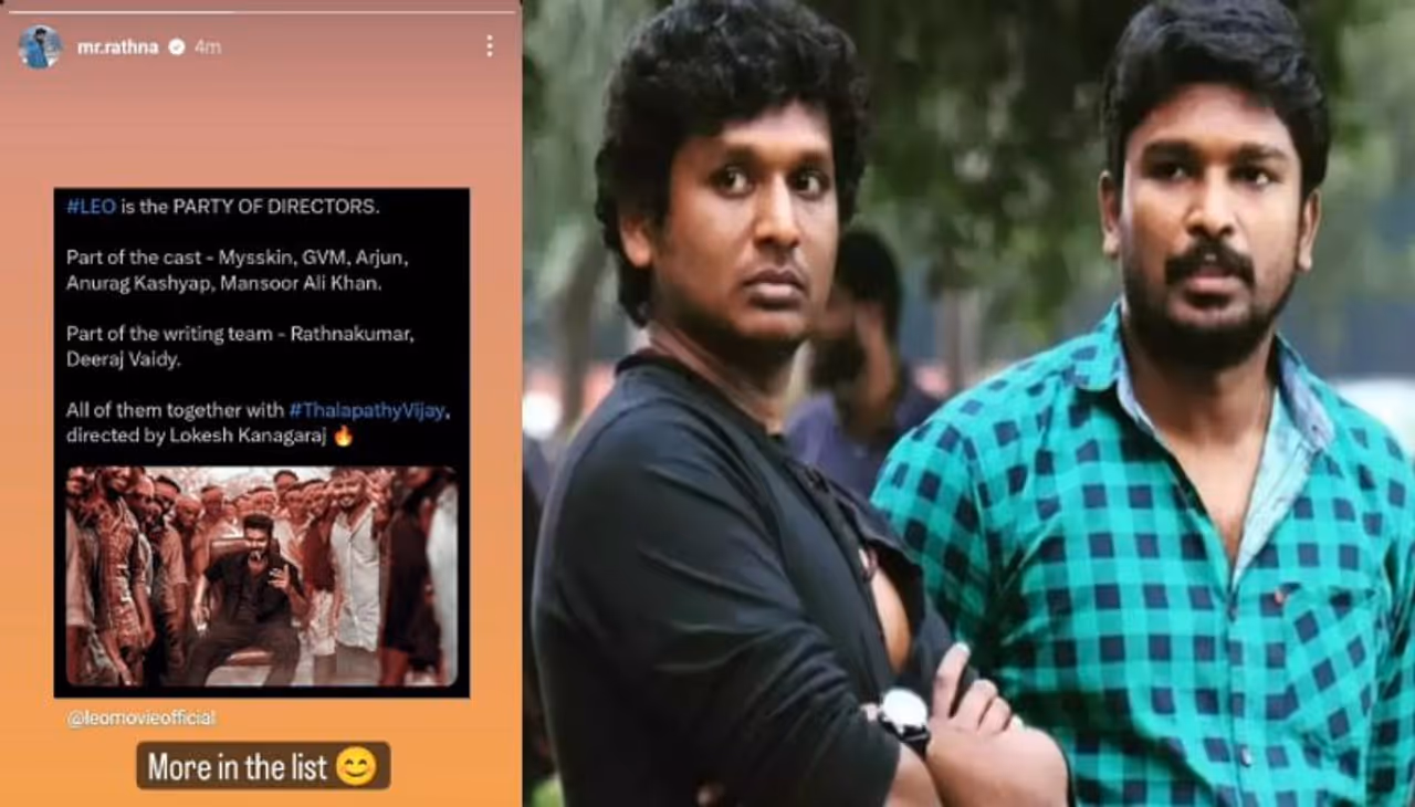 இந்நிலையில் பிரபல இயக்குனரும், மாஸ்டர், விக்ரம் மற்றும் லியோ திரைப்படங்களில் எழுத்தாளராகவும் பணியாற்றி வரும் ரத்தின குமார் ஒரு புதிய தகவலை தற்பொழுது வெளியிட்டுள்ளார். அவர் வெளியிட்டுள்ள தகவலின்படி லியோ திரைப்படத்தில் ஏற்கனவே 5 இயக்குனர்கள் நடித்து வருகின்றனர்.