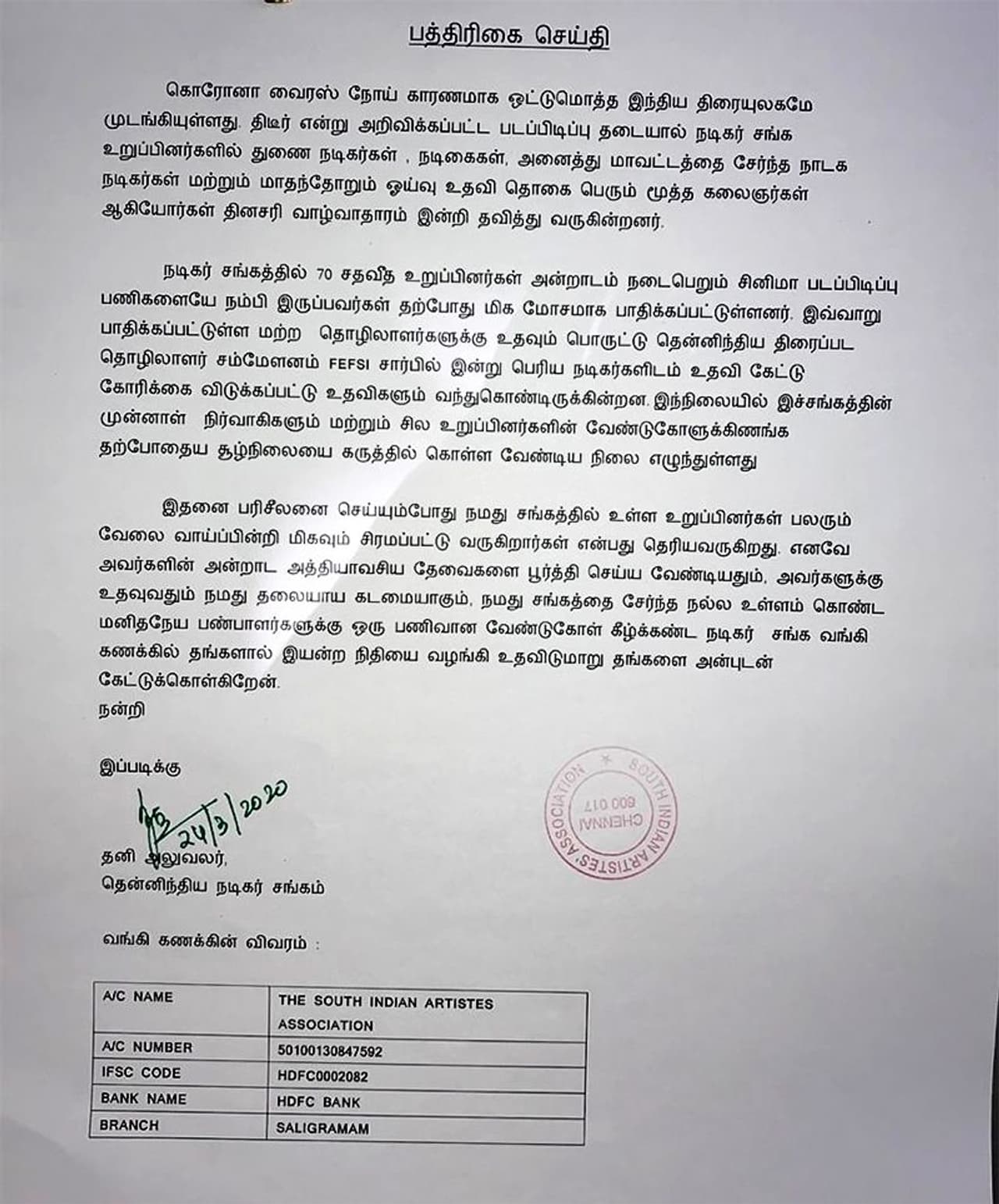 இந்த அறிக்கையில் கூறப்பட்டுள்ளதாவது... "கொரோனா வைரஸ் நோய் காரணமாக ஒட்டுமொத்த இந்திய திரையுலகமே முடங்கியுள்ளது. திடீர் என்று அறிவிக்கப்பட்ட படப்பிடிப்பு தடையால் நடிகர் சங்க உறுப்பினர்களில் துணை நடிகர்கள் . நடிகைகள், அனைத்து மாவட்டத்தை சேர்ந்த நாடக நடிகர்கள் மற்றும் மாதந்தோறும் ஓய்வு உதவி தொகை பெரும் மூத்த கலைஞர்கள் ஆகியோர்கள் தினசரி வாழ்வாதாரம் இன்றி தவித்து வருகின்றனர்.