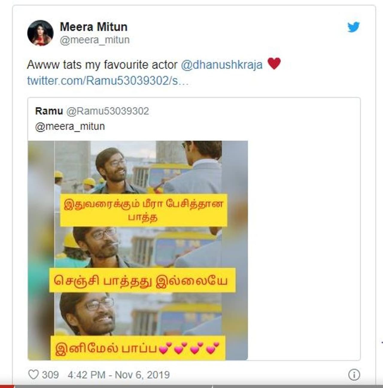 தற்போது தனுஷின் மீம்ஸ் ஒன்றை தனது டுவிட்டர் பக்கத்தில் வெளியிட்டுள்ள மீரா, தனக்கு மிகவும் பிடித்த நடிகர் என்று குறிப்பிட்டுள்ளார். அந்த மீம்ஸில், இதுவரை மீரா பேசிதானா பார்த்த, செஞ்சி பார்த்தது இல்லையே, இனிமே பார்ப்ப என்று உள்ளது.