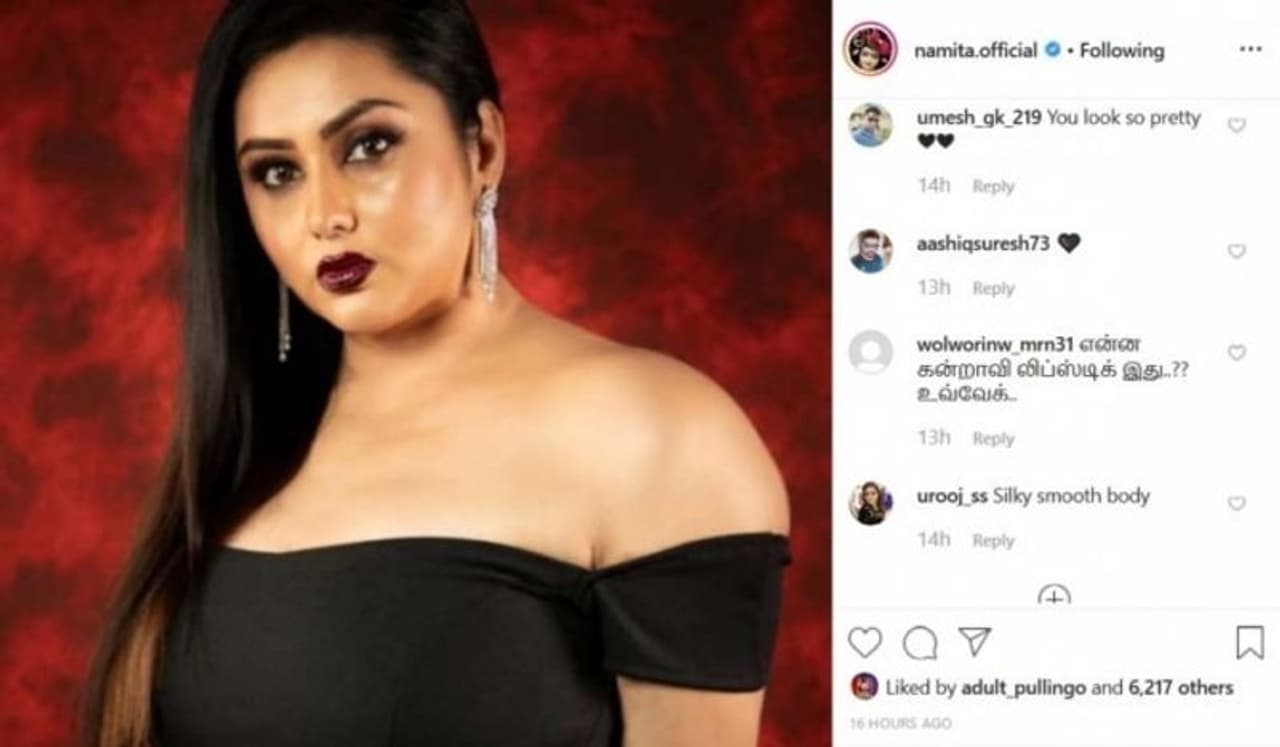 சமீபத்தில் அடர் சிவப்பு நிற லிப்ஸ்டிக்கை ஓவராக போட்டு, கறுப்பு நிற உடையில் செம்ம கிளாமராக எடுத்த புகைப்படங்களை நமீதா தனது இன்ஸ்டாகிராம் பக்கத்தில் பதிவிட்டிருந்தார்.